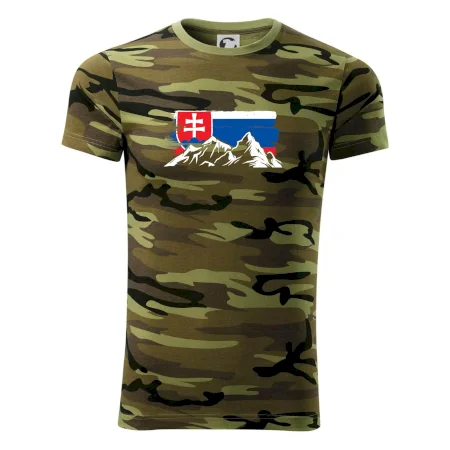 Tričko střední gramáže v barvách camouflage. Střih s bočními švy. Lem průkrčníku ze žebrového úpletu s přídavkem 5 % elastanu. Vnitřní část zadního průkrčníku začištěna páskou v barvě camouflage.