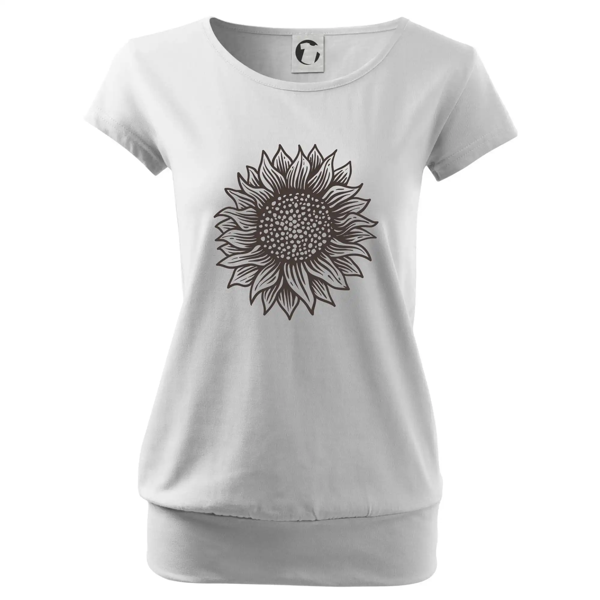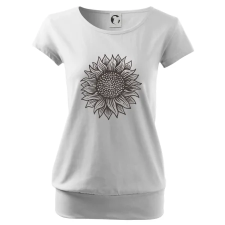 Trendové dámské triko s velmi krátkým rukávem, volnějšího střihu, v dolním kraji všité do širokého lemu. Kulatý průkrčník s úzkým lemem ze shodného materiálu.