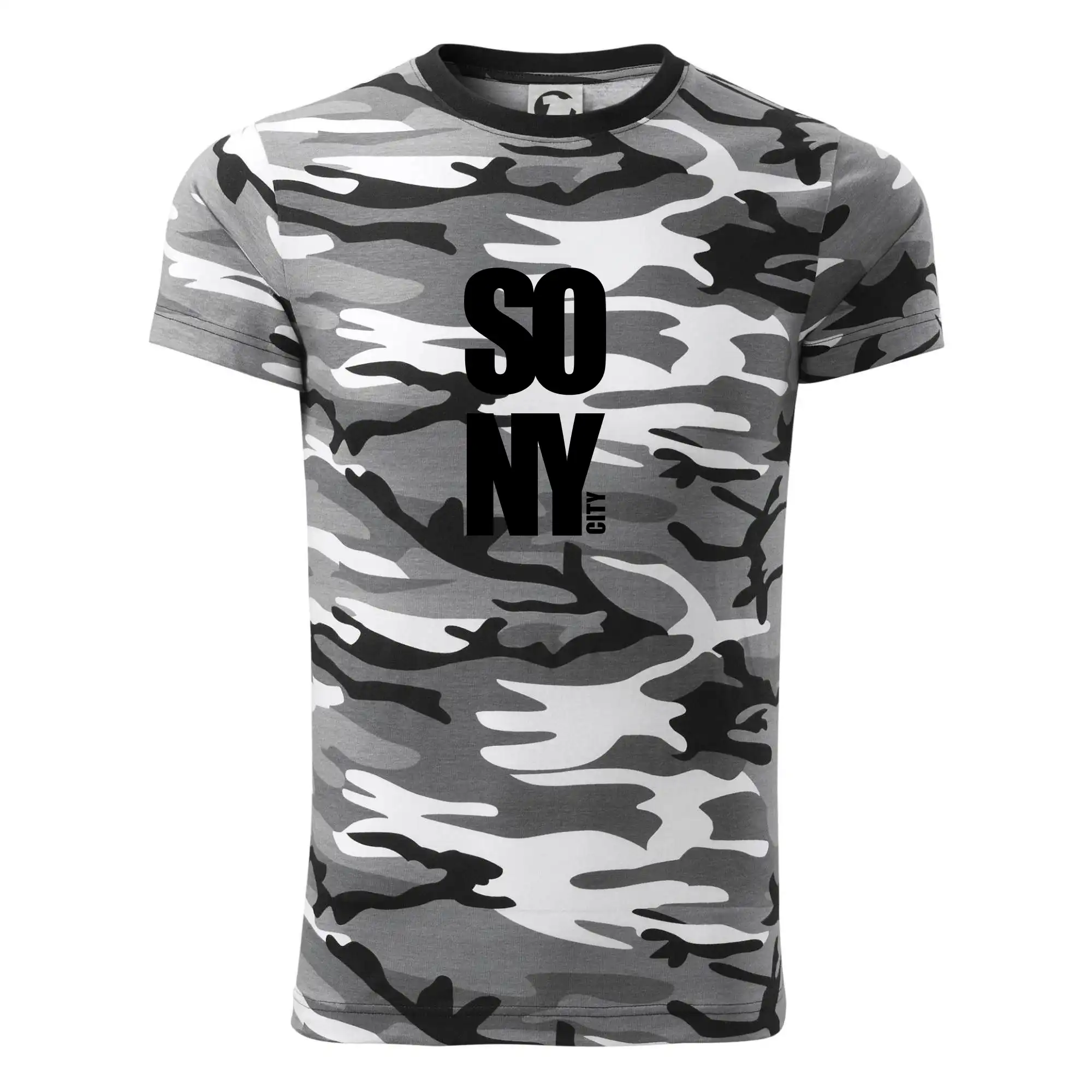 Tričko střední gramáže v barvách camouflage. Střih s bočními švy. Lem průkrčníku ze žebrového úpletu s přídavkem 5 % elastanu. Vnitřní část zadního průkrčníku začištěna páskou v barvě camouflage.