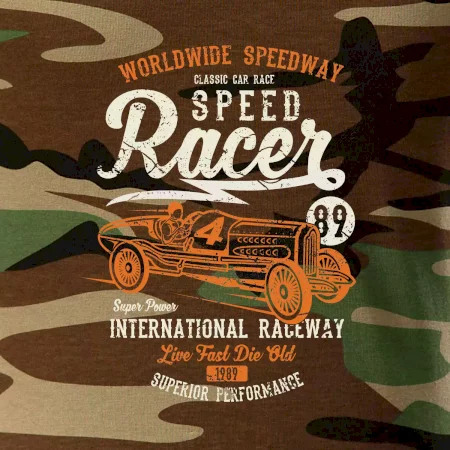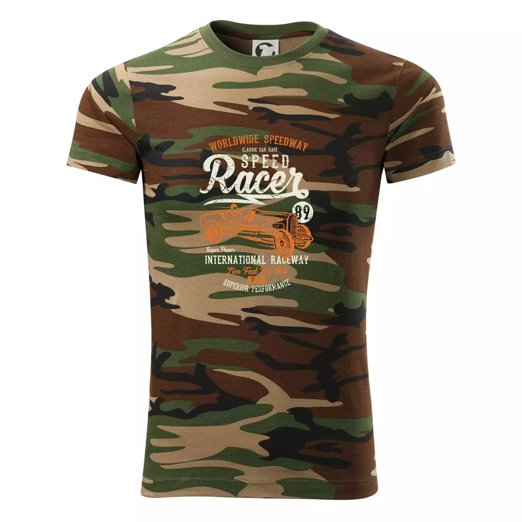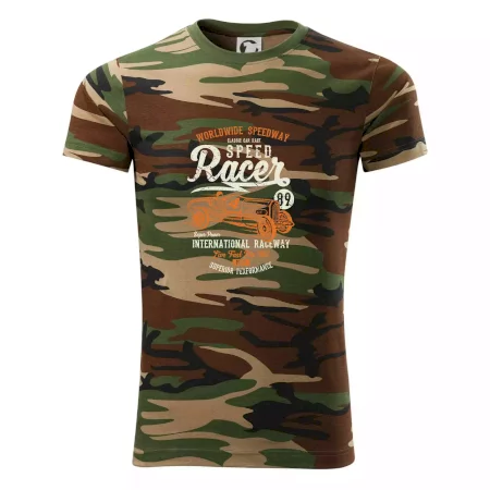 Tričko střední gramáže v barvách camouflage. Střih s bočními švy. Lem průkrčníku ze žebrového úpletu s přídavkem 5 % elastanu. Vnitřní část zadního průkrčníku začištěna páskou v barvě camouflage.