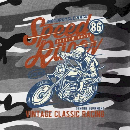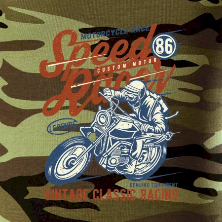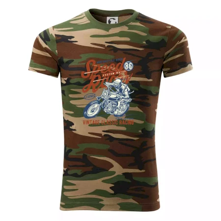 Tričko střední gramáže v barvách camouflage. Střih s bočními švy. Lem průkrčníku ze žebrového úpletu s přídavkem 5 % elastanu. Vnitřní část zadního průkrčníku začištěna páskou v barvě camouflage.