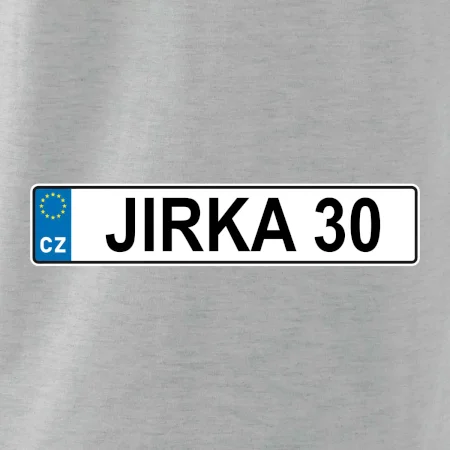 Narozeninové triko s motivem SPZ na auto. Triko pro oslavence Jirku, který slaví jubileum 30 let. Dárek ke třicátinám. Narozeninová poznávačka s nápisem Jirka 30. Triko s "espézetkou" k narozeninám. Oslav třicátiny s tímhle trikem!