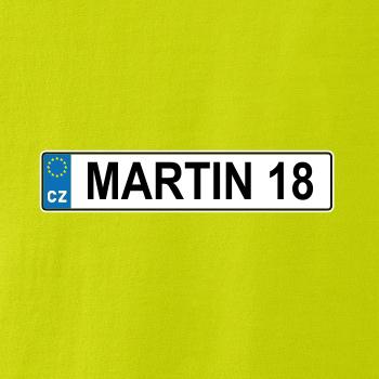 Narozeninové triko s motivem SPZ na auto. Triko pro oslavence Martina, který slaví jubileum 18 let. Dárek k osmnáctinám. Narozeninová poznávačka s nápisem Martin 18. Triko s "espézetkou" k narozeninám. Oslav plnoletost - osmnáctiny s tímhle trikem!