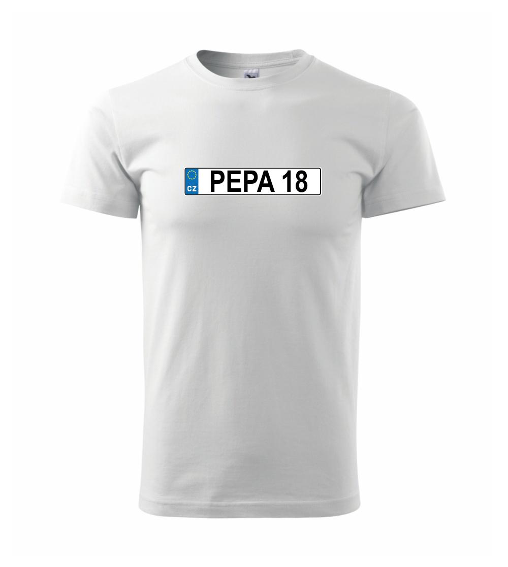 Narozeninové triko s motivem SPZ na auto. Triko pro oslavence Pepu, který slaví jubileum 18 let. Dárek k osmnáctinám. Narozeninová poznávačka s nápisem Pepa 18. Triko s "espézetkou" k narozeninám. Oslav plnoletost - osmnáctiny tímhle trikem!