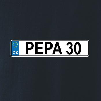 Narozeninové triko s motivem SPZ na auto. Triko pro oslavence Pepu, který slaví jubileum 30 let. Dárek ke třicátinám. Narozeninová poznávačka s nápisem Pepa 30. Triko s "espézetkou" k narozeninám. Oslav třicátiny tímhle trikem!