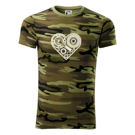 Tričko střední gramáže v barvách camouflage. Střih s bočními švy. Lem průkrčníku ze žebrového úpletu s přídavkem 5 % elastanu. Vnitřní část zadního průkrčníku začištěna páskou v barvě camouflage.