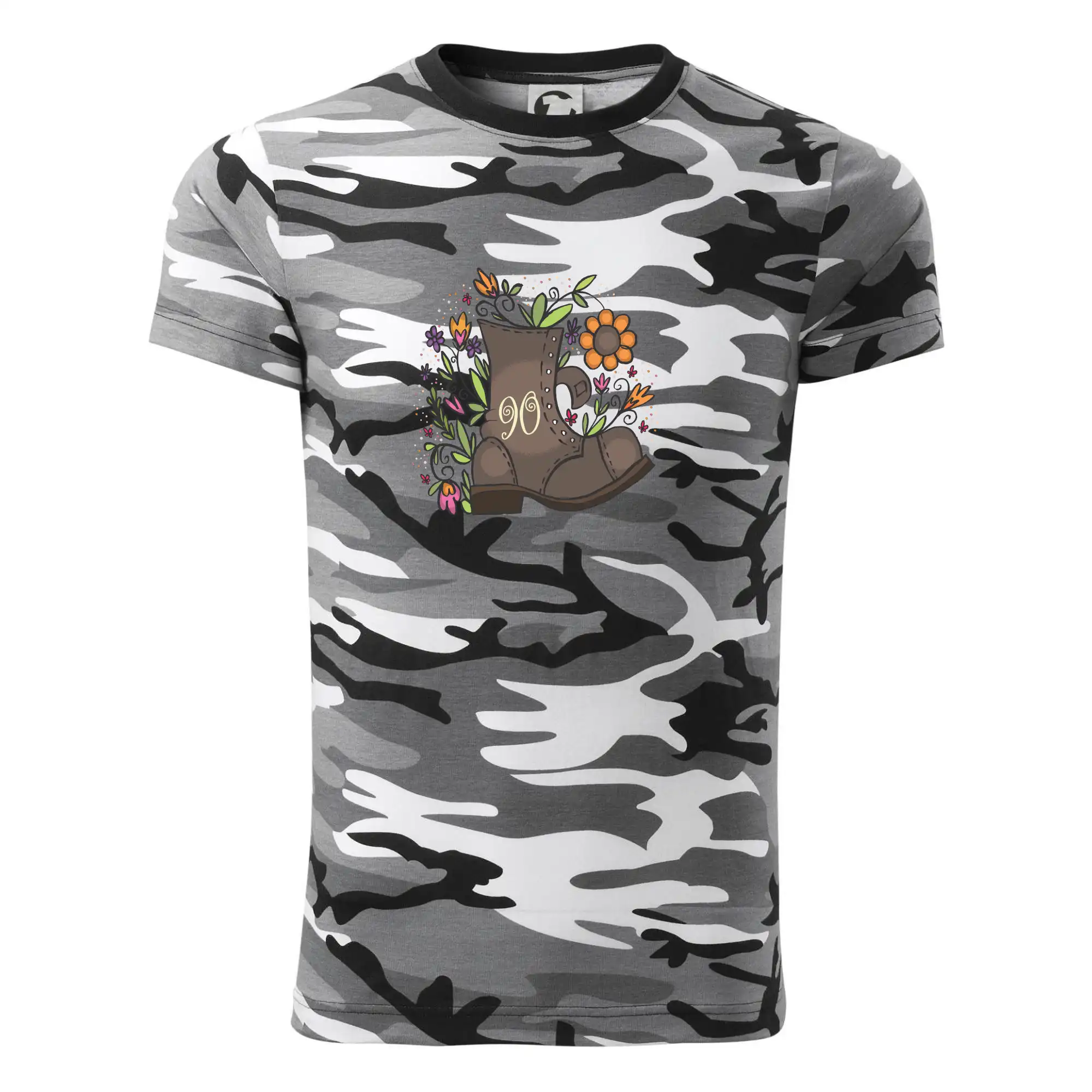 Tričko střední gramáže v barvách camouflage. Střih s bočními švy. Lem průkrčníku ze žebrového úpletu s přídavkem 5 % elastanu. Vnitřní část zadního průkrčníku začištěna páskou v barvě camouflage.