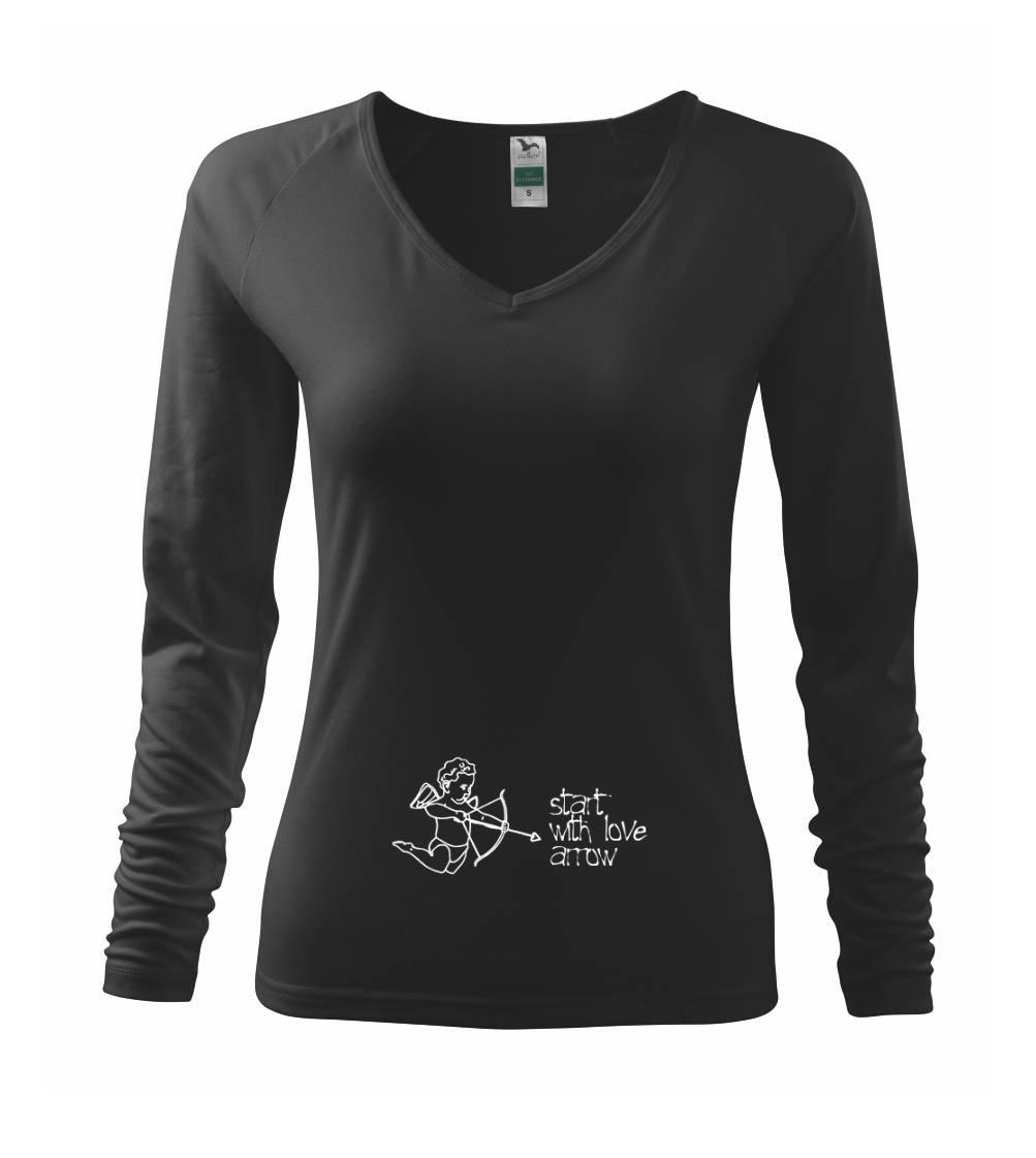 Trička pro všechny těhotné. Pořiď své kamarádce v jináči vtipný dárek! Vtipné triko, na kterém je amorek s lukem a šípem a nápis "start with love arrow", je pěkný dárek pro maminku v očekávání.