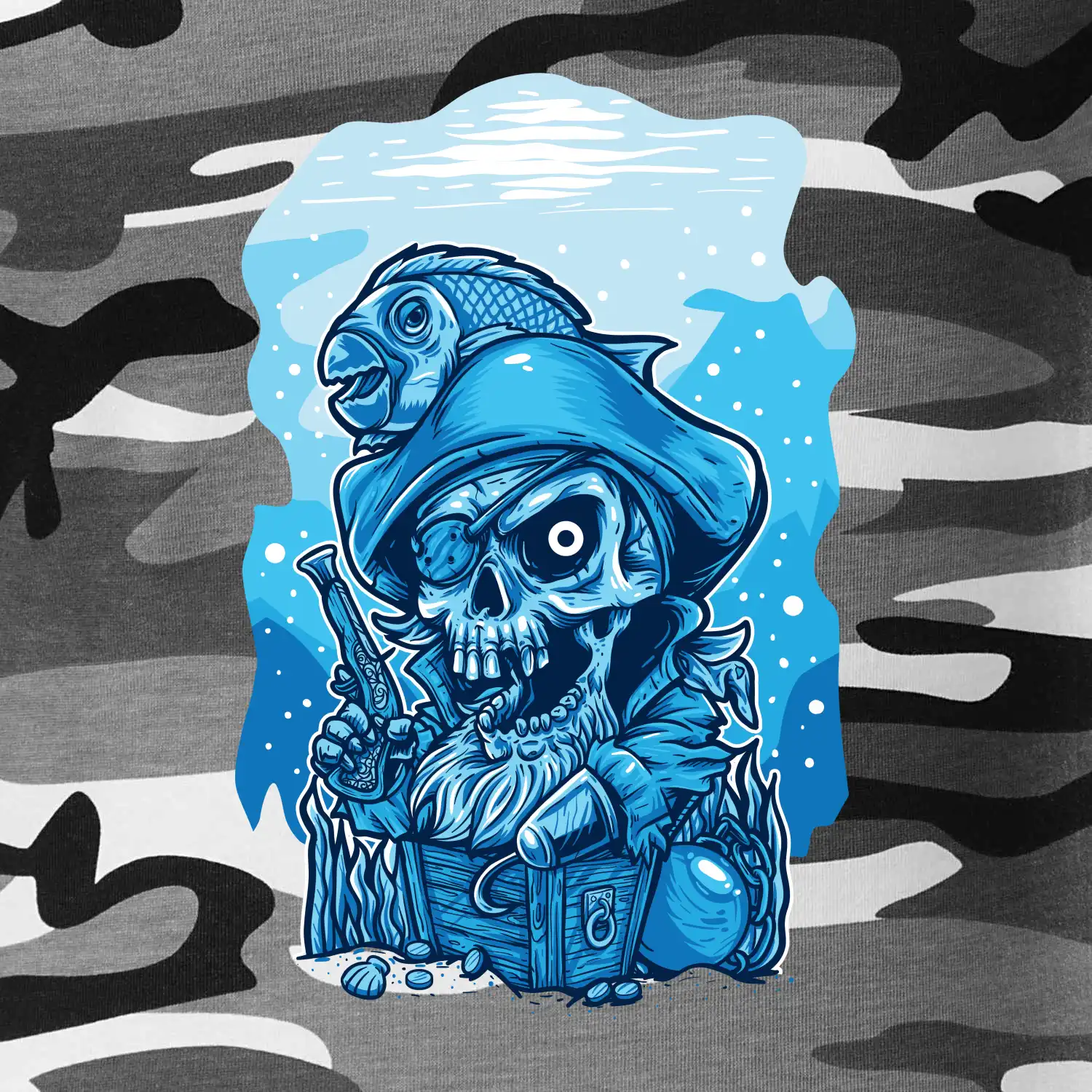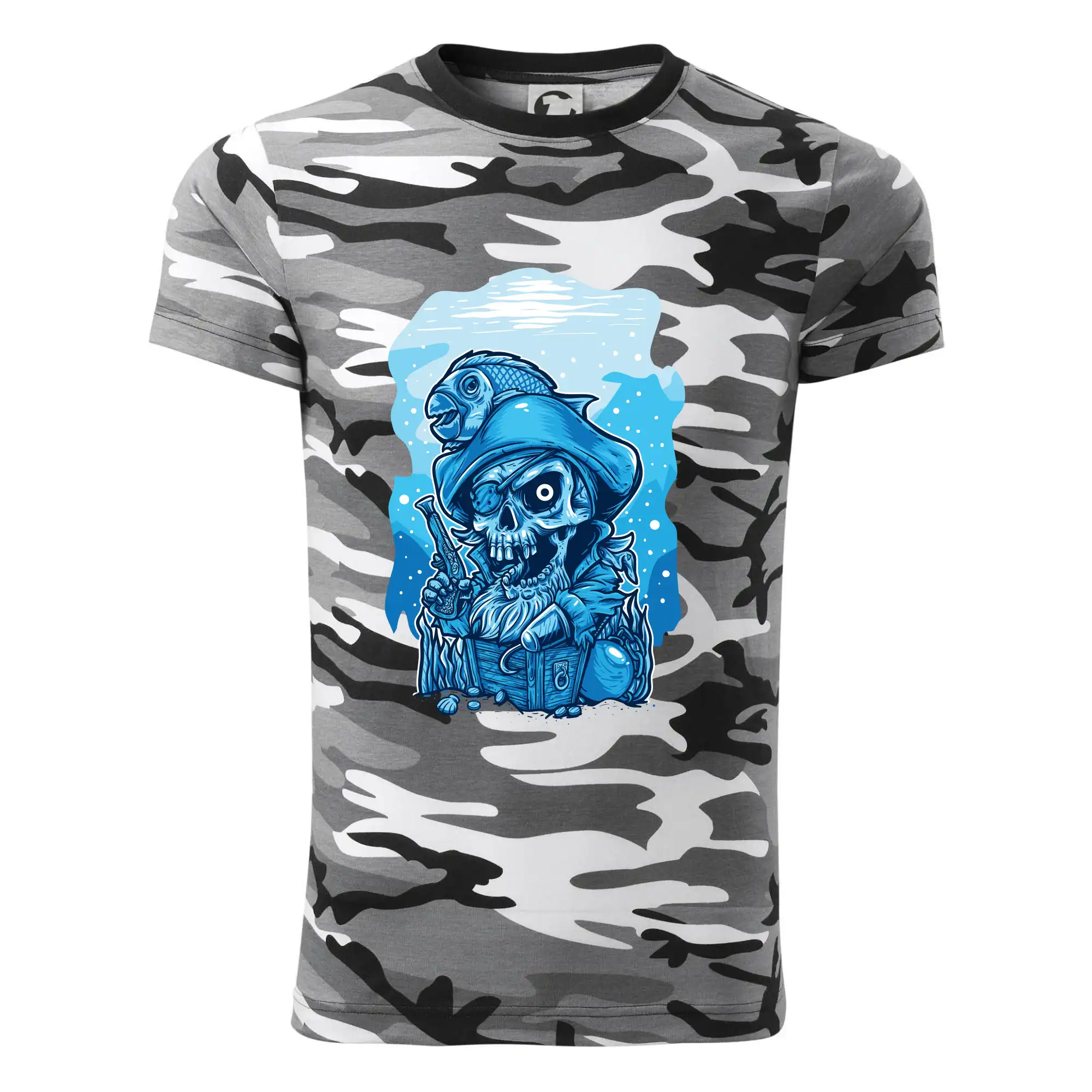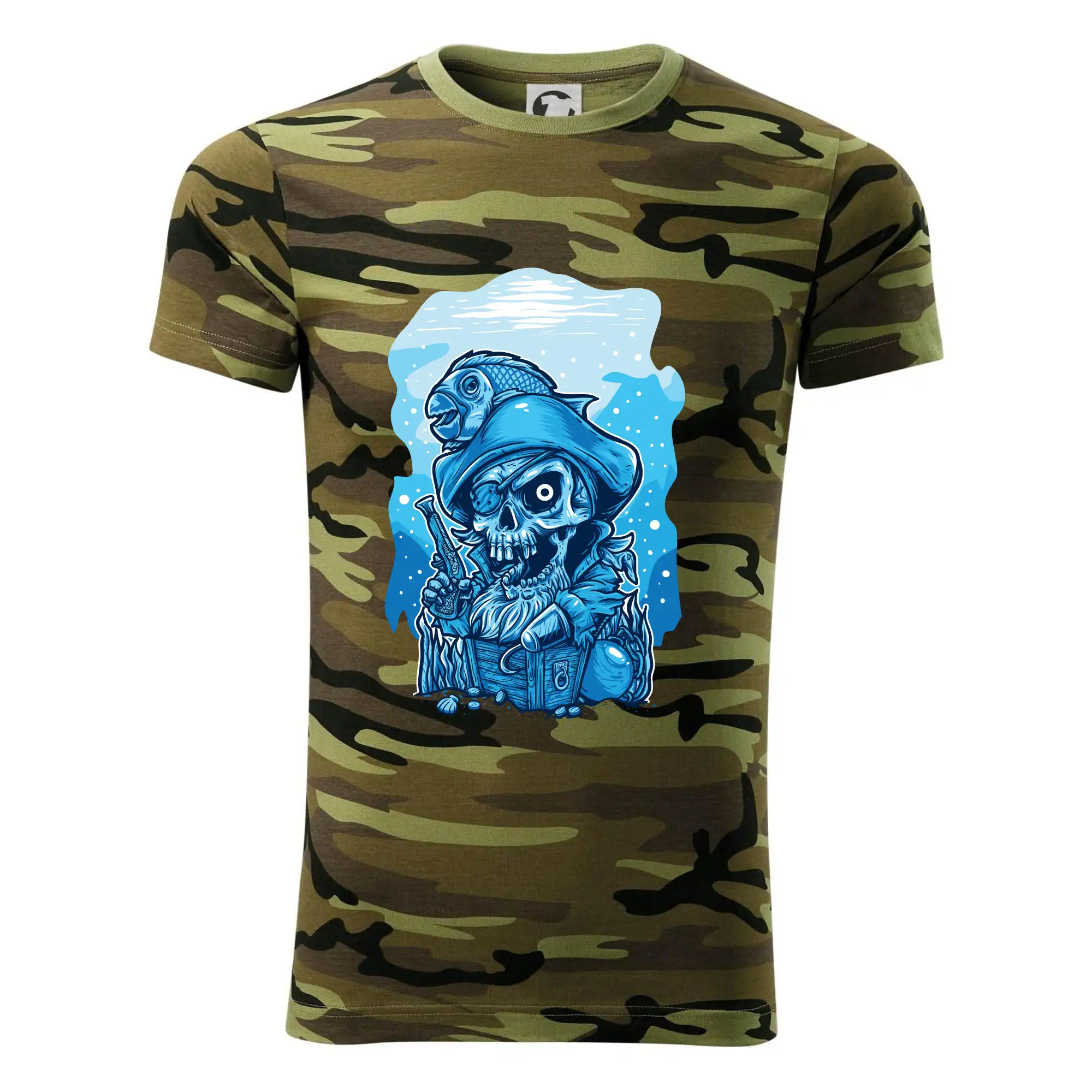 Tričko střední gramáže v barvách camouflage. Střih s bočními švy. Lem průkrčníku ze žebrového úpletu s přídavkem 5 % elastanu. Vnitřní část zadního průkrčníku začištěna páskou v barvě camouflage.