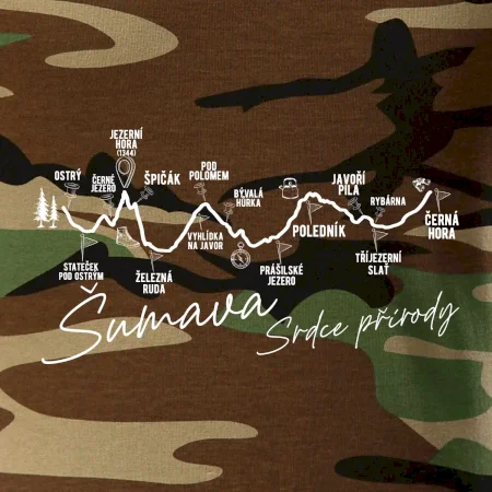 Tričko střední gramáže v barvách camouflage. Střih s bočními švy. Lem průkrčníku ze žebrového úpletu s přídavkem 5 % elastanu. Vnitřní část zadního průkrčníku začištěna páskou v barvě camouflage.