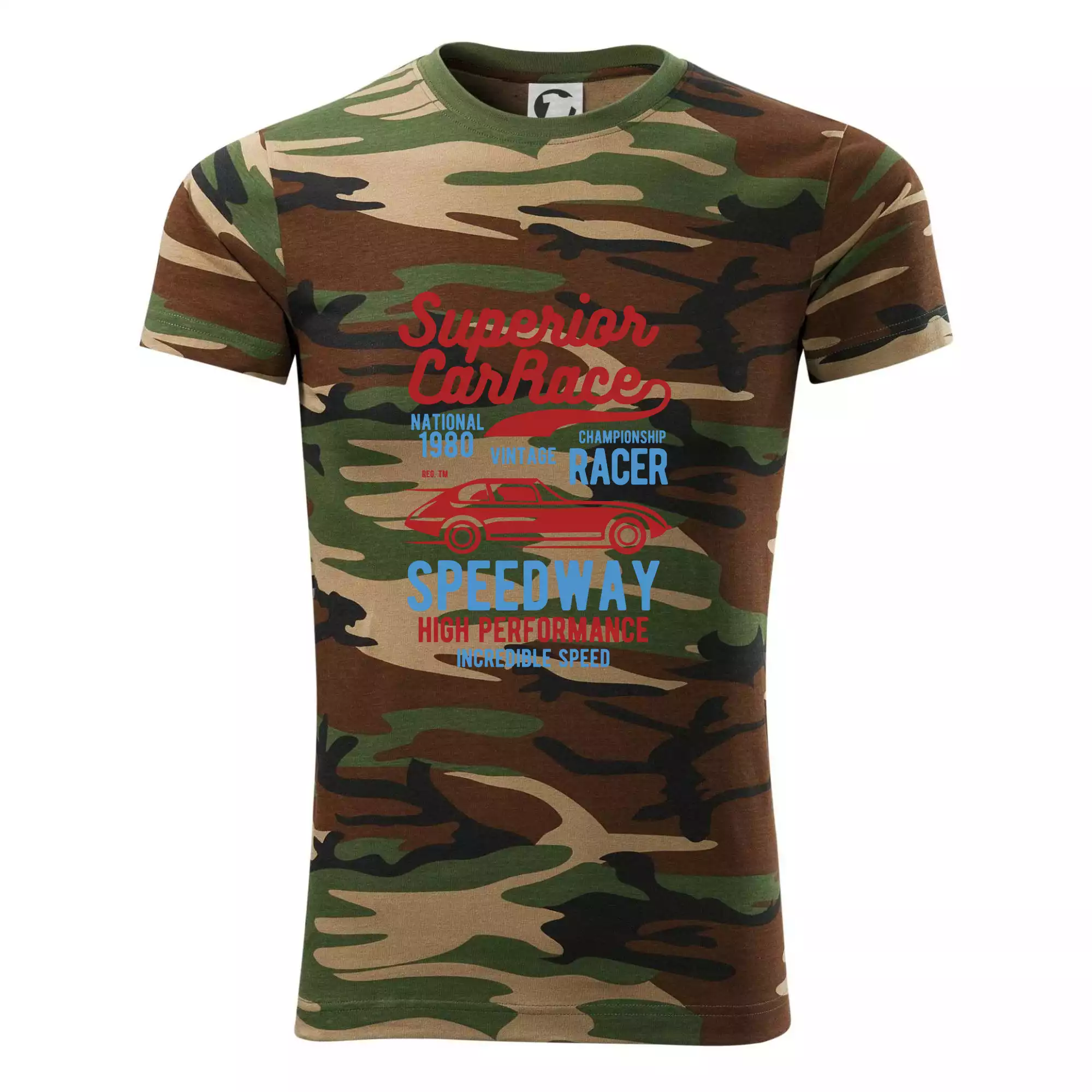 Tričko střední gramáže v barvách camouflage. Střih s bočními švy. Lem průkrčníku ze žebrového úpletu s přídavkem 5 % elastanu. Vnitřní část zadního průkrčníku začištěna páskou v barvě camouflage.
