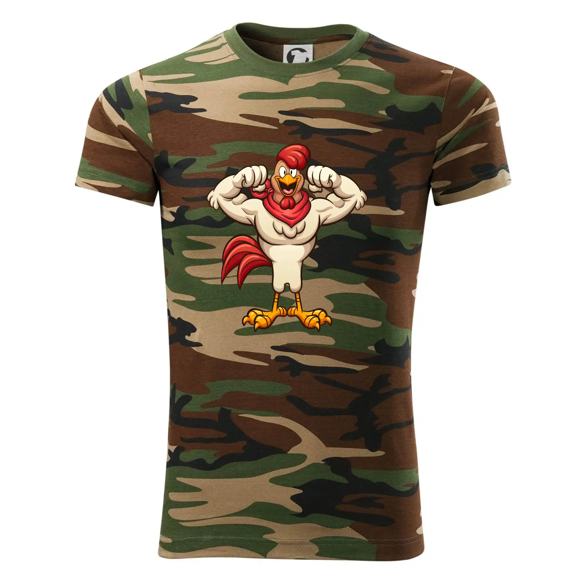 Tričko střední gramáže v barvách camouflage. Střih s bočními švy. Lem průkrčníku ze žebrového úpletu s přídavkem 5 % elastanu. Vnitřní část zadního průkrčníku začištěna páskou v barvě camouflage.