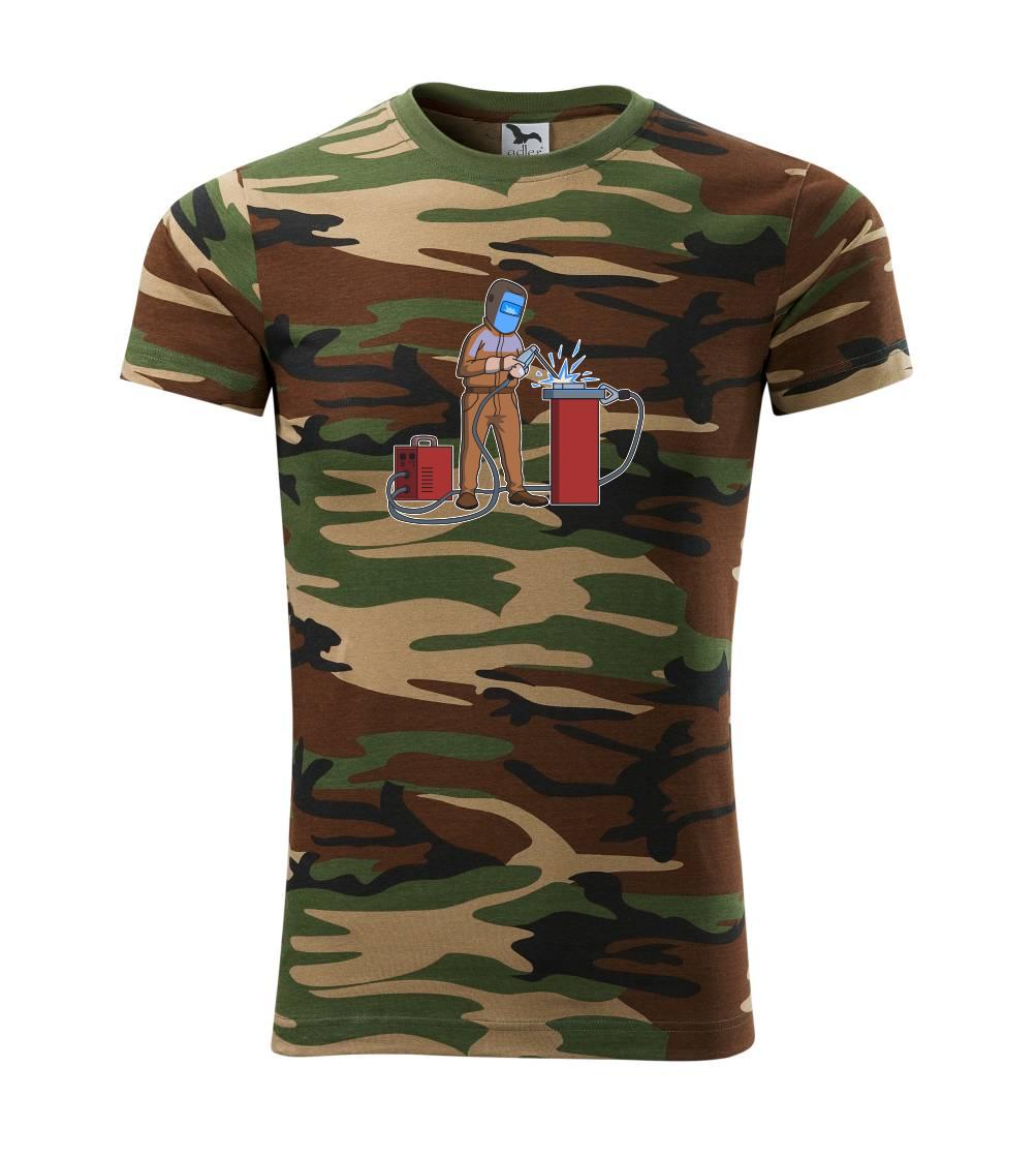 Tričko střední gramáže v barvách camouflage. Střih s bočními švy. Lem průkrčníku ze žebrového úpletu s přídavkem 5 % elastanu. Vnitřní část zadního průkrčníku začištěna páskou v barvě camouflage.