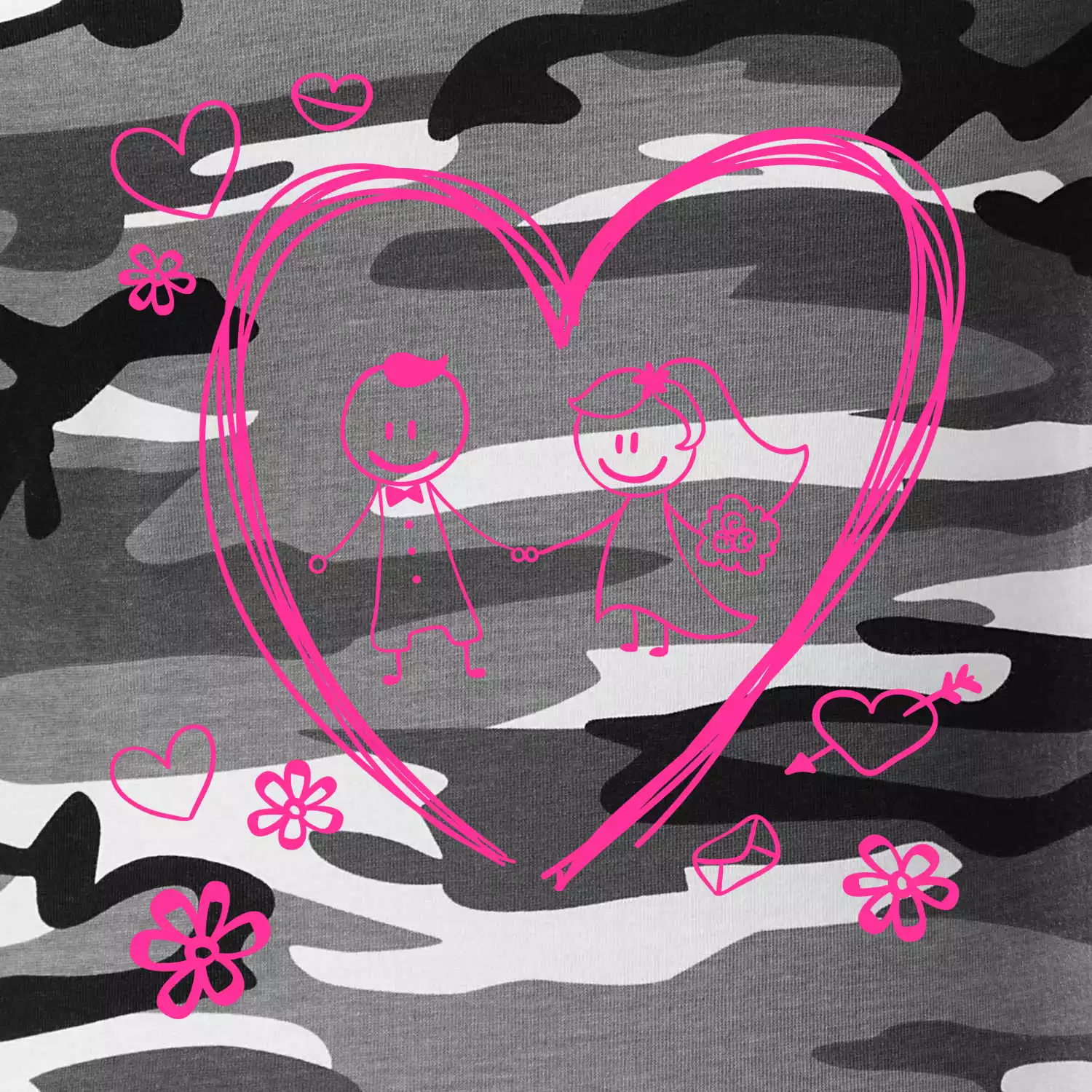 Tričko střední gramáže v barvách camouflage. Střih s bočními švy. Lem průkrčníku ze žebrového úpletu s přídavkem 5 % elastanu. Vnitřní část zadního průkrčníku začištěna páskou v barvě camouflage.