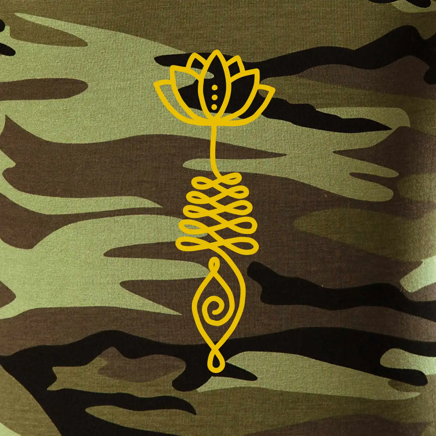 Tričko střední gramáže v barvách camouflage. Střih s bočními švy. Lem průkrčníku ze žebrového úpletu s přídavkem 5 % elastanu. Vnitřní část zadního průkrčníku začištěna páskou v barvě camouflage.