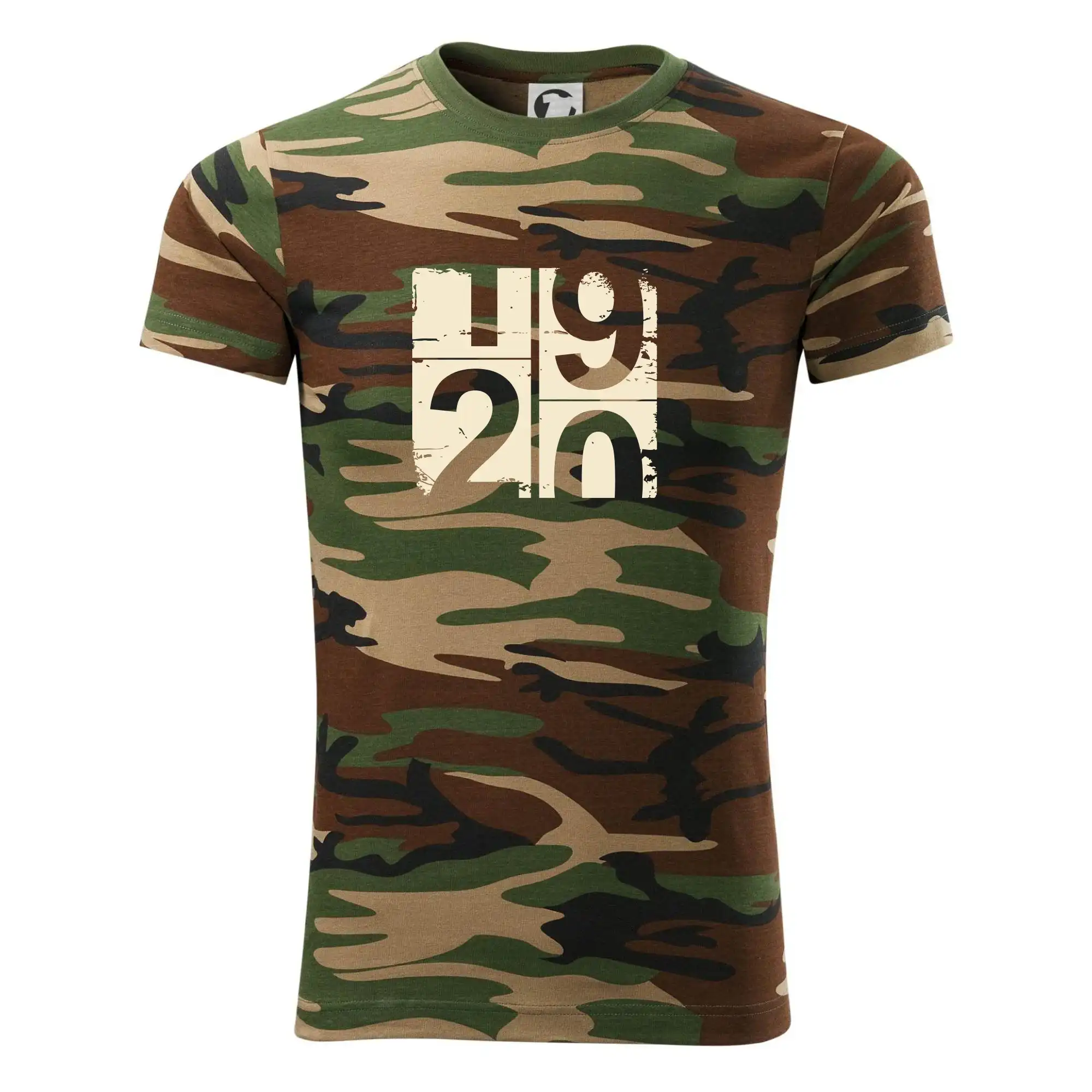 Tričko střední gramáže v barvách camouflage. Střih s bočními švy. Lem průkrčníku ze žebrového úpletu s přídavkem 5 % elastanu. Vnitřní část zadního průkrčníku začištěna páskou v barvě camouflage.