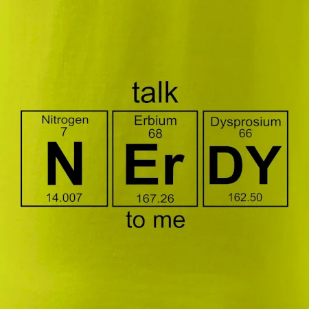 Trička a mikiny pro milovníky chemie, originálních věcí a humoru. Periodické tabulky lze provést v jakékoliv variantě! Pokud jsi nerd, tohle triko pro tebe bude to pravé. Triko, na kterém je periodická tabulka prvků, je vhodný dárek pro každého nerda a geeka. Triko pro nerda s nápisem talk NErDY to me vytvořeným z prvků periodické tabulky.