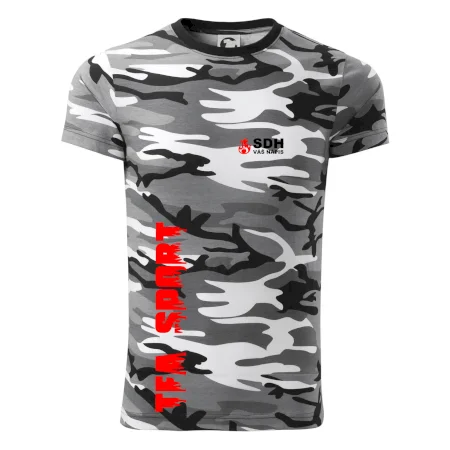 Tričko střední gramáže v barvách camouflage. Střih s bočními švy. Lem průkrčníku ze žebrového úpletu s přídavkem 5 % elastanu. Vnitřní část zadního průkrčníku začištěna páskou v barvě camouflage.