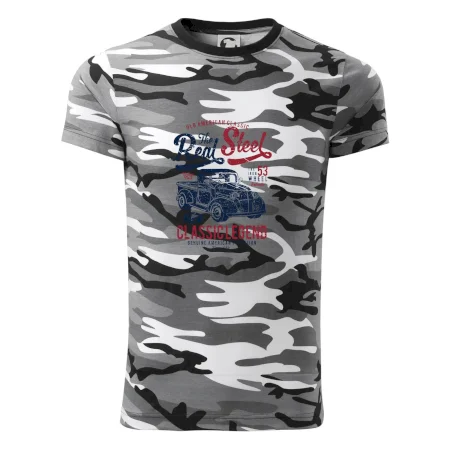 Tričko střední gramáže v barvách camouflage. Střih s bočními švy. Lem průkrčníku ze žebrového úpletu s přídavkem 5 % elastanu. Vnitřní část zadního průkrčníku začištěna páskou v barvě camouflage.