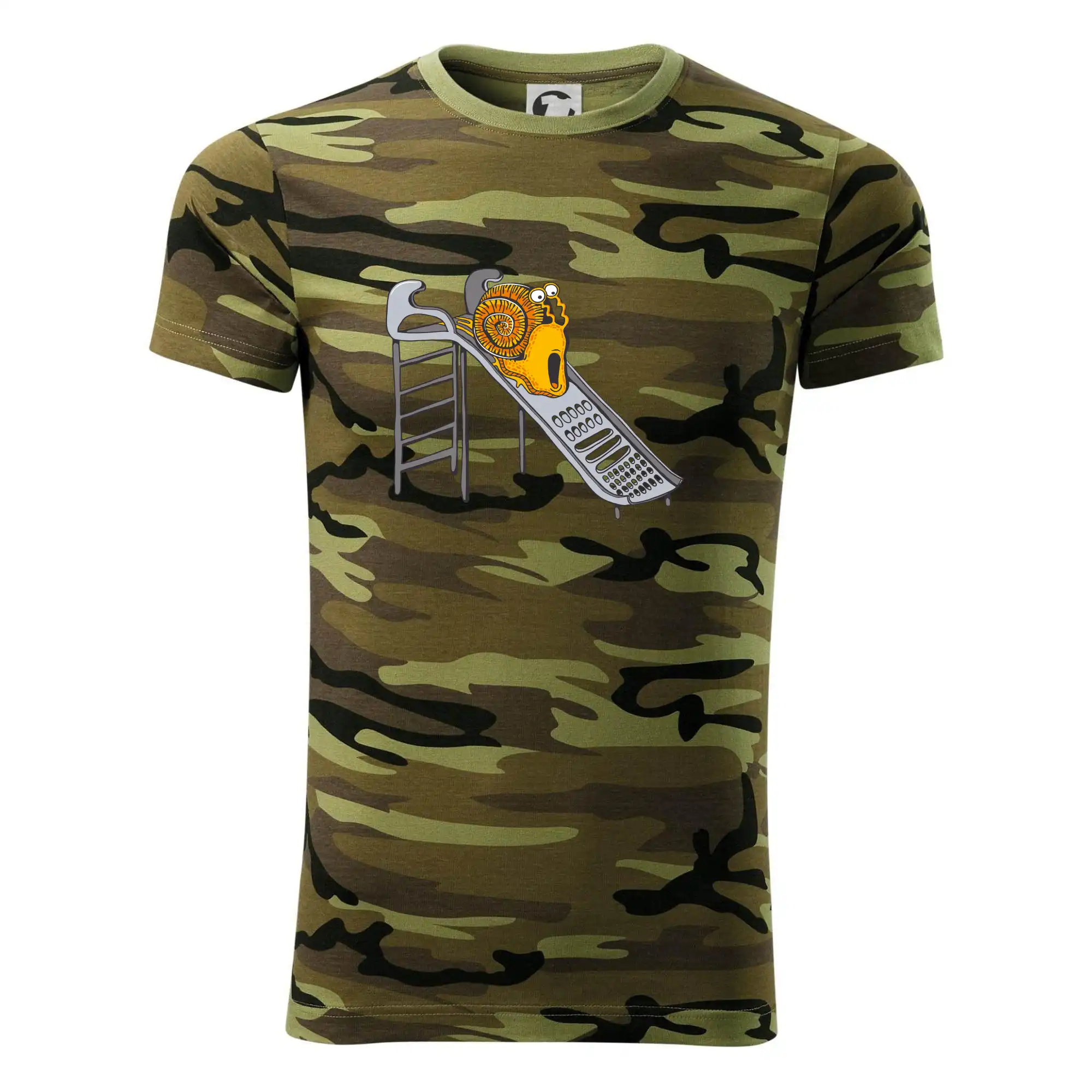 Tričko střední gramáže v barvách camouflage. Střih s bočními švy. Lem průkrčníku ze žebrového úpletu s přídavkem 5 % elastanu. Vnitřní část zadního průkrčníku začištěna páskou v barvě camouflage.