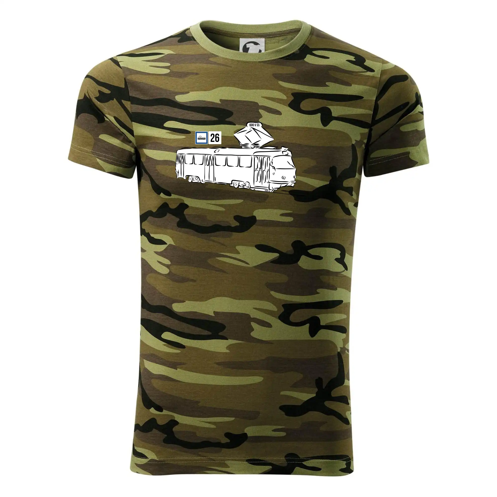 Tričko střední gramáže v barvách camouflage. Střih s bočními švy. Lem průkrčníku ze žebrového úpletu s přídavkem 5 % elastanu. Vnitřní část zadního průkrčníku začištěna páskou v barvě camouflage.