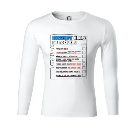 Rozlučkové triko pro ženicha s úkoly, které musí splnit. K triku přidáme i fix na textil, aby mohli kumpáni úkoly pečlivě odškrtávat.