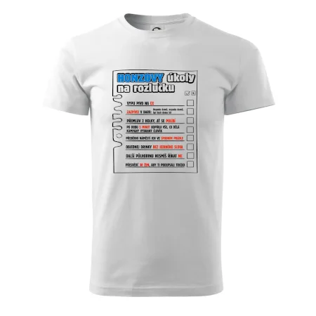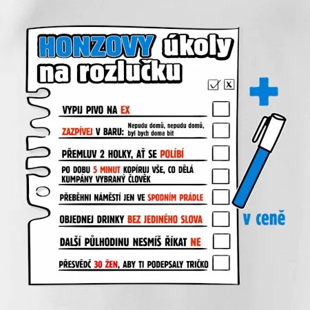 Rozlučkové triko pro ženicha s úkoly, které musí splnit. K triku přidáme i fix na textil, aby mohli kumpáni úkoly pečlivě odškrtávat.