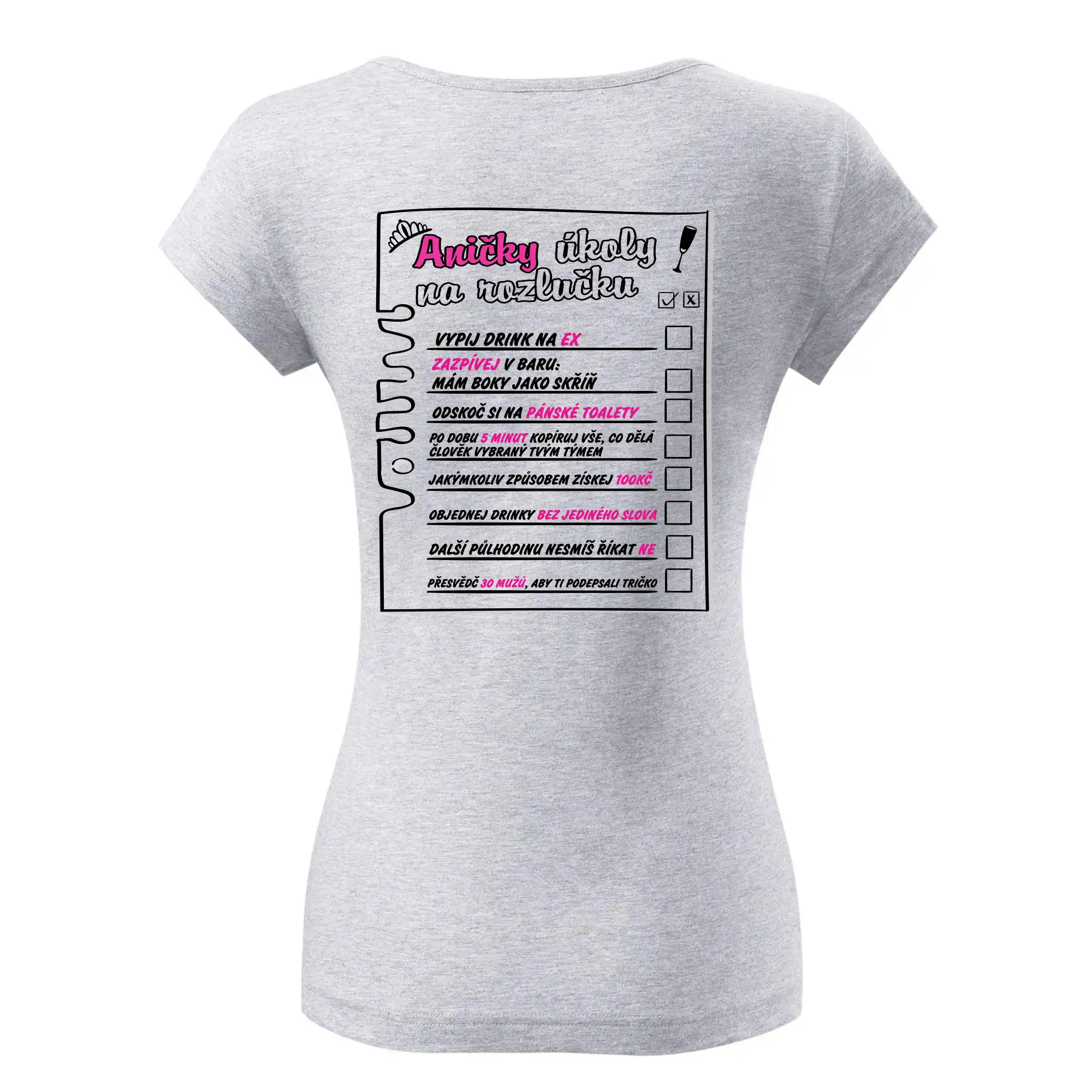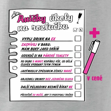 Rozlučkové triko pro nevěstu s úkoly, které musí splnit. K triku přidáme i fix na textil, aby mohl nevěsty tým úkoly pečlivě odškrtávat.