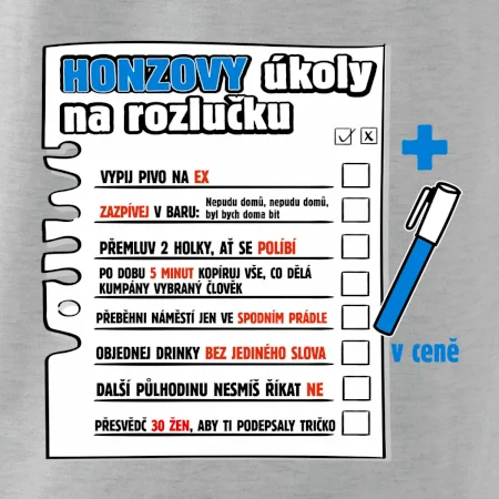 Rozlučkové triko pro ženicha s úkoly, které musí splnit. K triku přidáme i fix na textil, aby mohli kumpáni úkoly pečlivě odškrtávat.