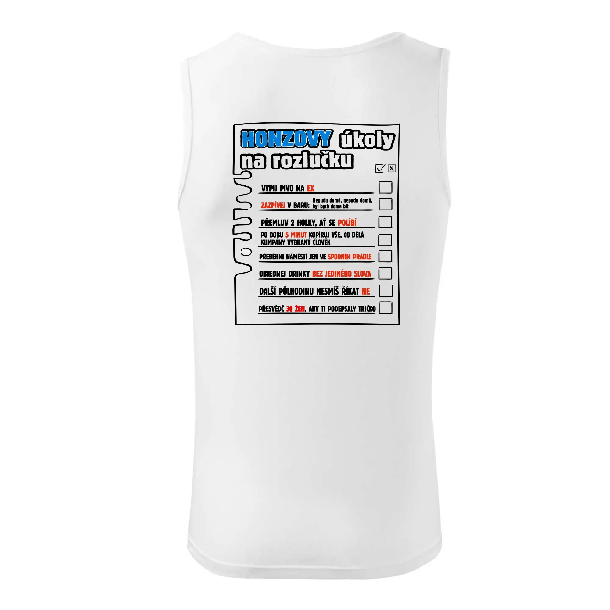Rozlučkové triko pro ženicha s úkoly, které musí splnit. K triku přidáme i fix na textil, aby mohli kumpáni úkoly pečlivě odškrtávat.