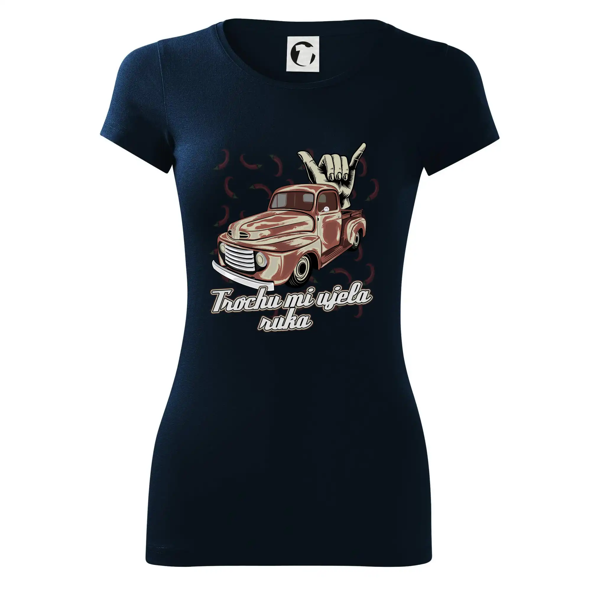Vtipné triko pro kuchaře s nápisem "Trochu mi ujela ruka" a chilli papričkami. Pálivé papričky se musí přidávat opatrně, někdy to ale nevyjde a je jich v jídle tolik, že by to nastartovalo i auto.
