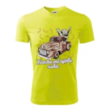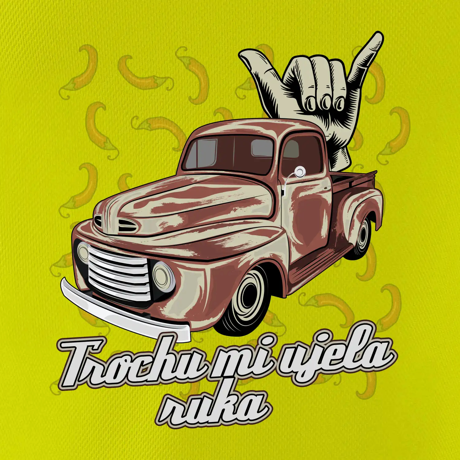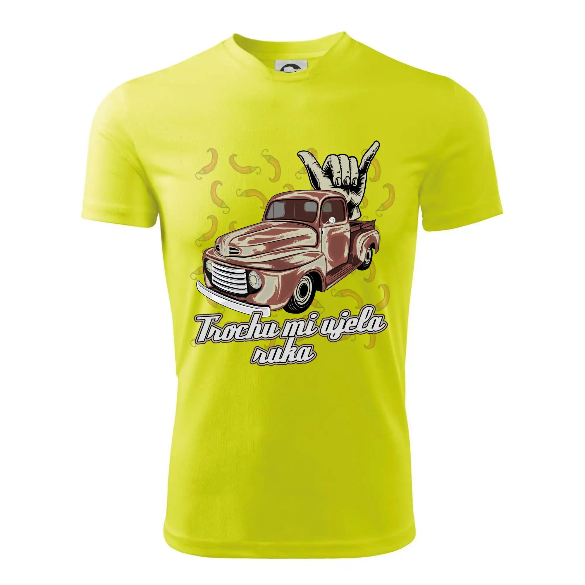 Vtipné triko pro kuchaře s nápisem "Trochu mi ujela ruka" a chilli papričkami. Pálivé papričky se musí přidávat opatrně, někdy to ale nevyjde a je jich v jídle tolik, že by to nastartovalo i auto.