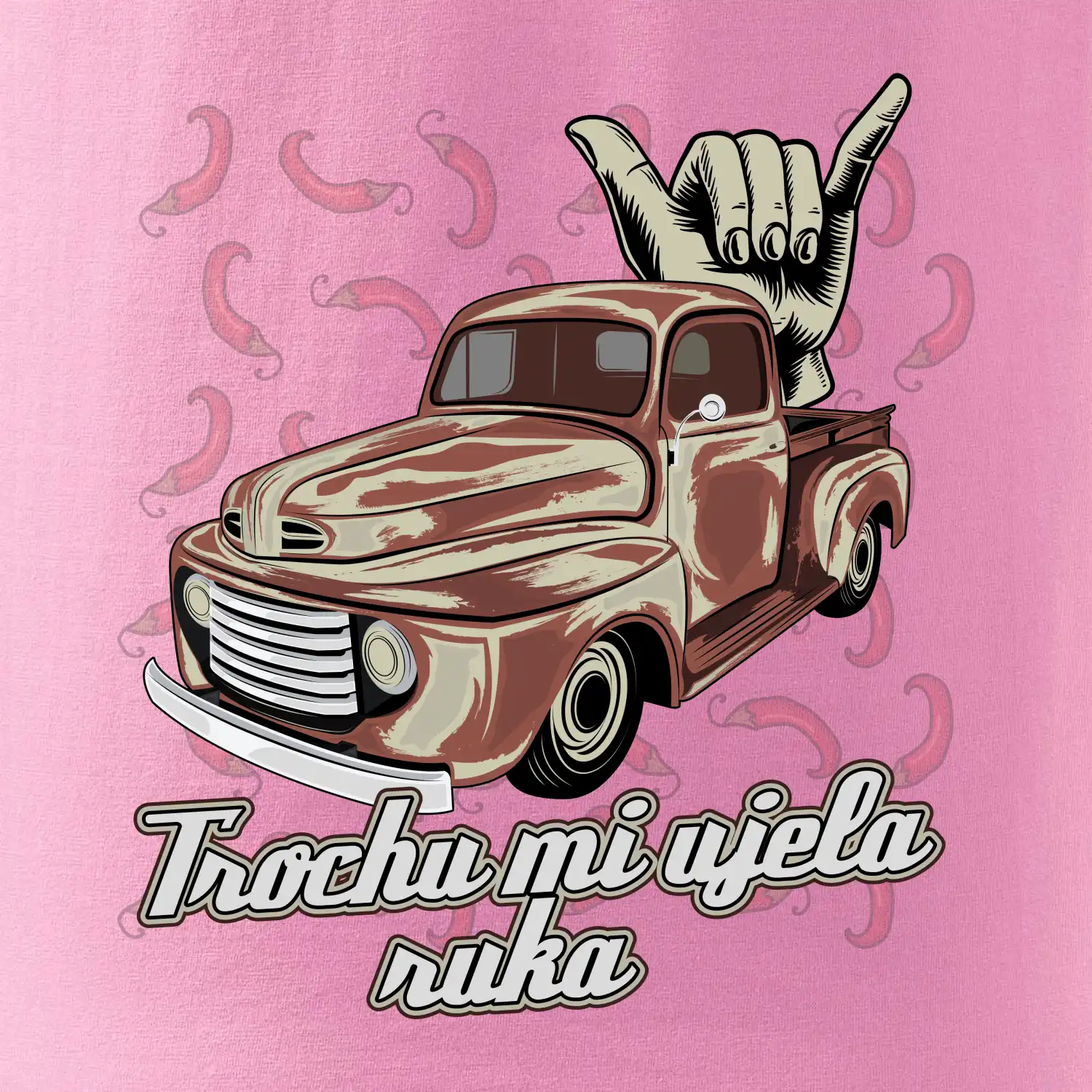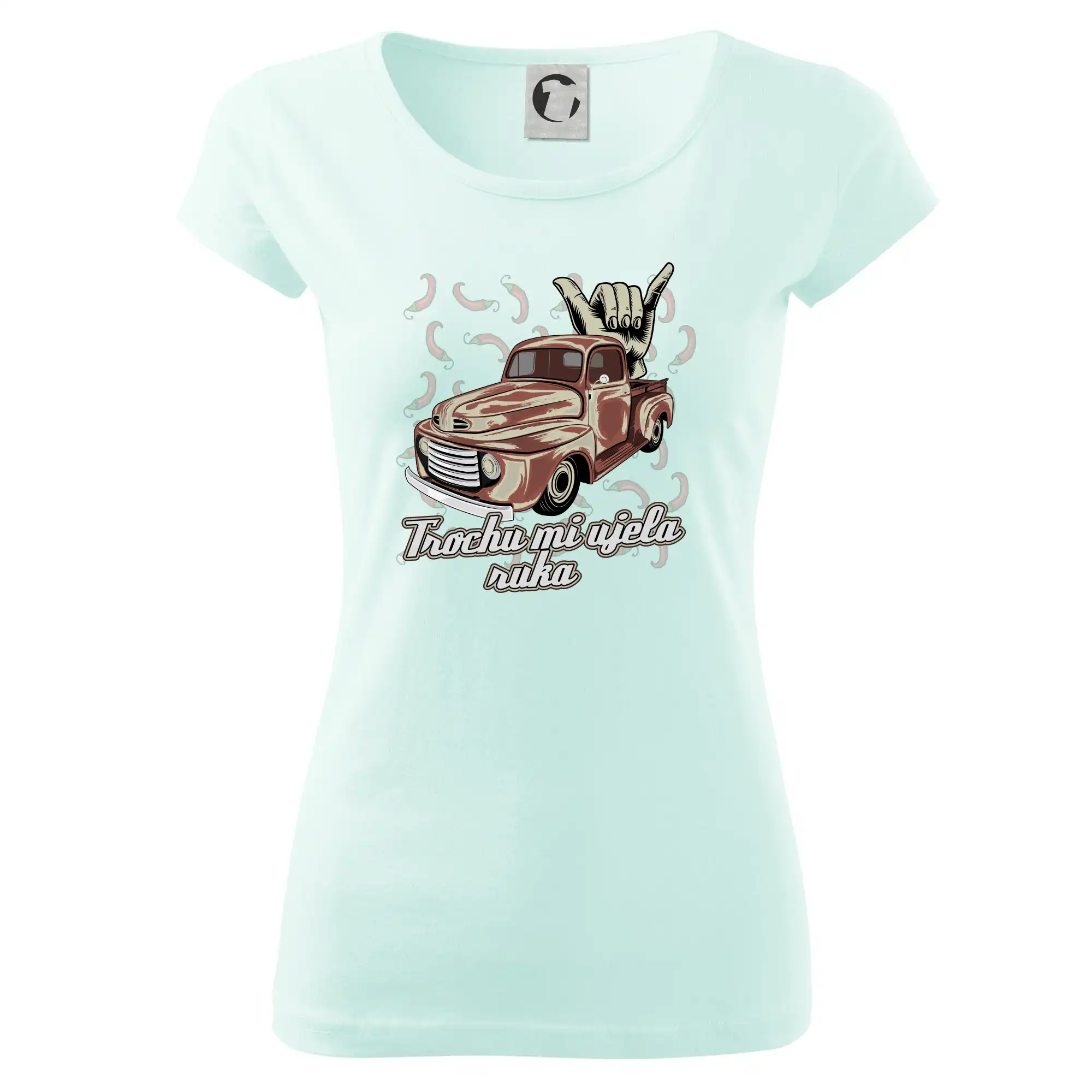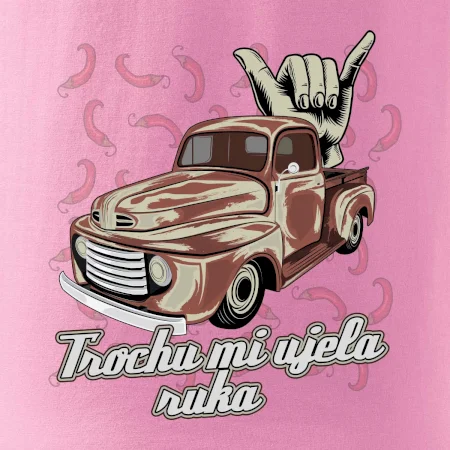 Vtipné triko pro kuchaře s nápisem "Trochu mi ujela ruka" a chilli papričkami. Pálivé papričky se musí přidávat opatrně, někdy to ale nevyjde a je jich v jídle tolik, že by to nastartovalo i auto.