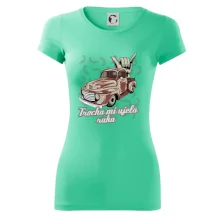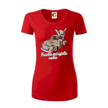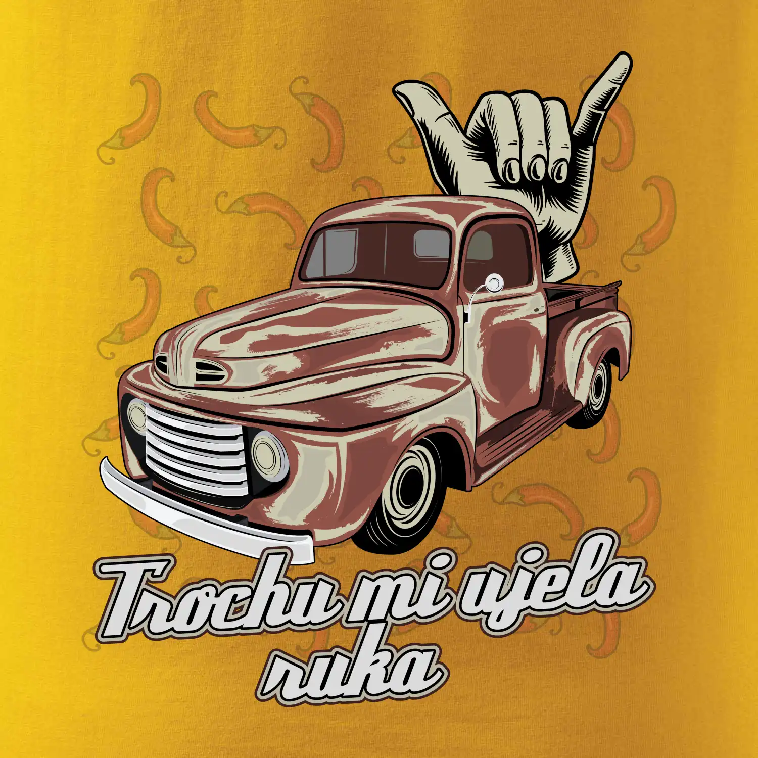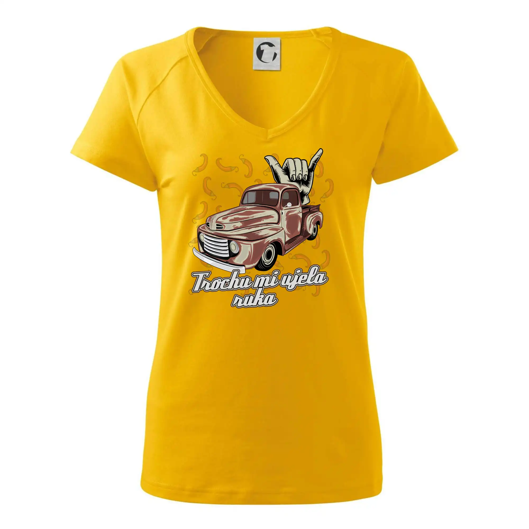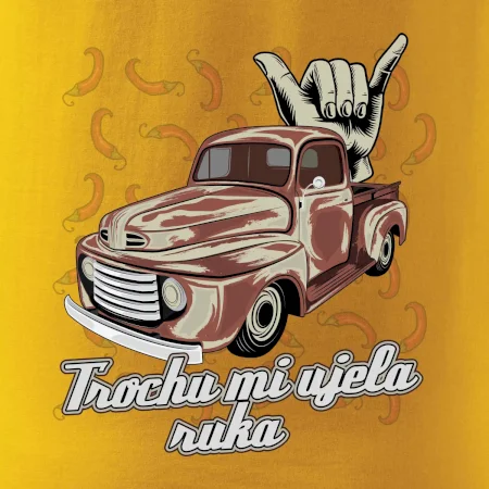 Vtipné triko pro kuchaře s nápisem "Trochu mi ujela ruka" a chilli papričkami. Pálivé papričky se musí přidávat opatrně, někdy to ale nevyjde a je jich v jídle tolik, že by to nastartovalo i auto.