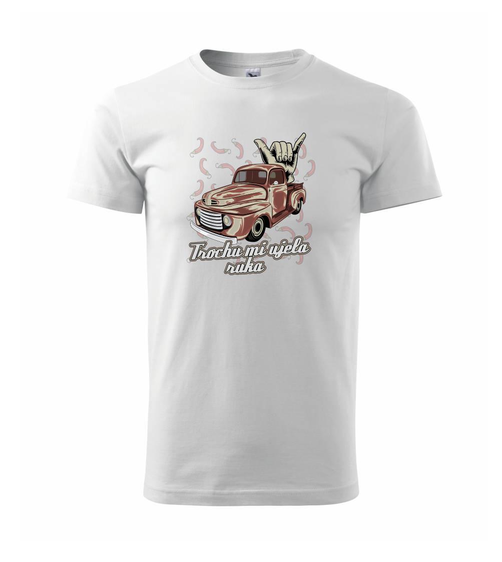 Vtipné triko pro kuchaře s nápisem "Trochu mi ujela ruka" a chilli papričkami. Pálivé papričky se musí přidávat opatrně, někdy to ale nevyjde a je jich v jídle tolik, že by to nastartovalo i auto.