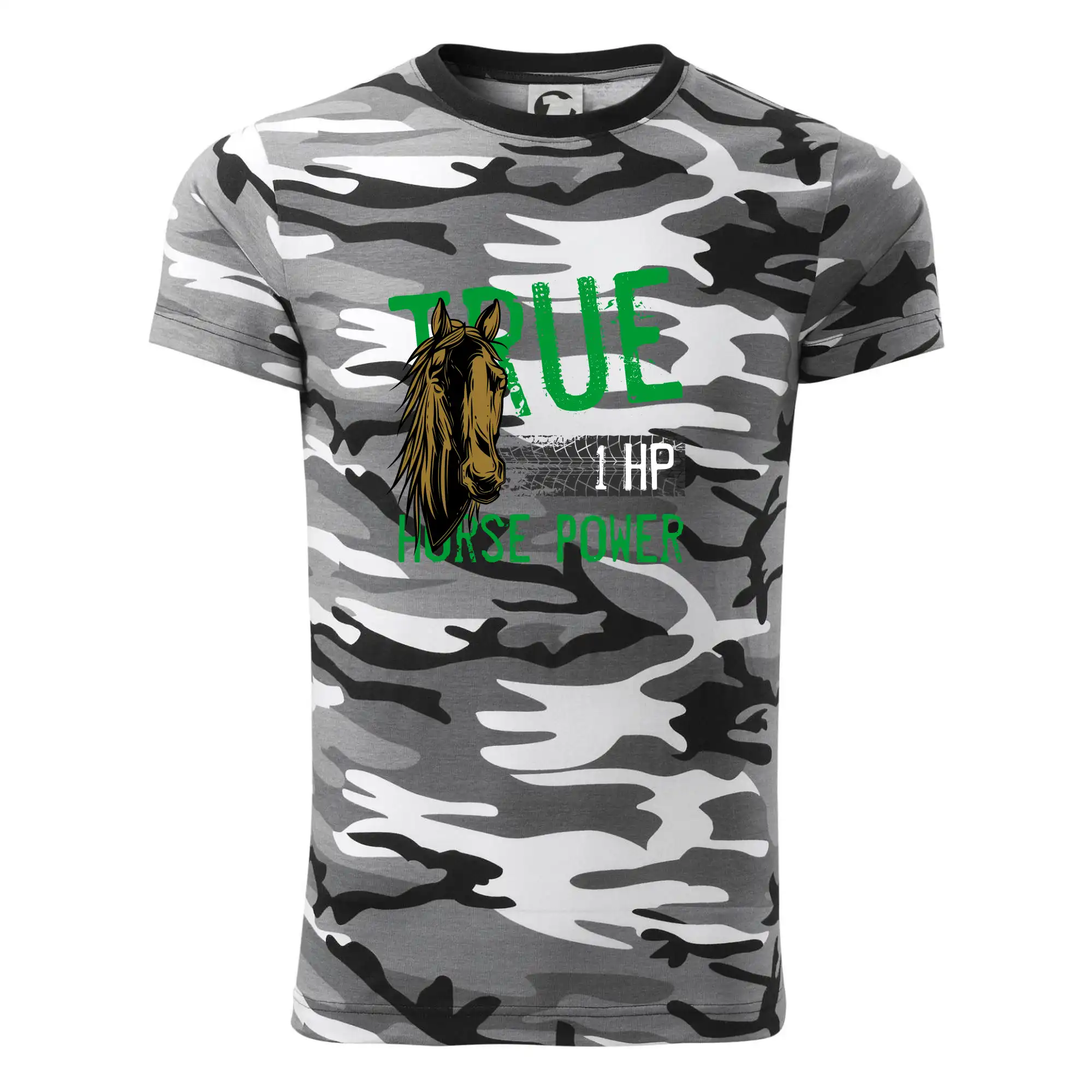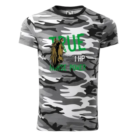 Tričko střední gramáže v barvách camouflage. Střih s bočními švy. Lem průkrčníku ze žebrového úpletu s přídavkem 5 % elastanu. Vnitřní část zadního průkrčníku začištěna páskou v barvě camouflage.