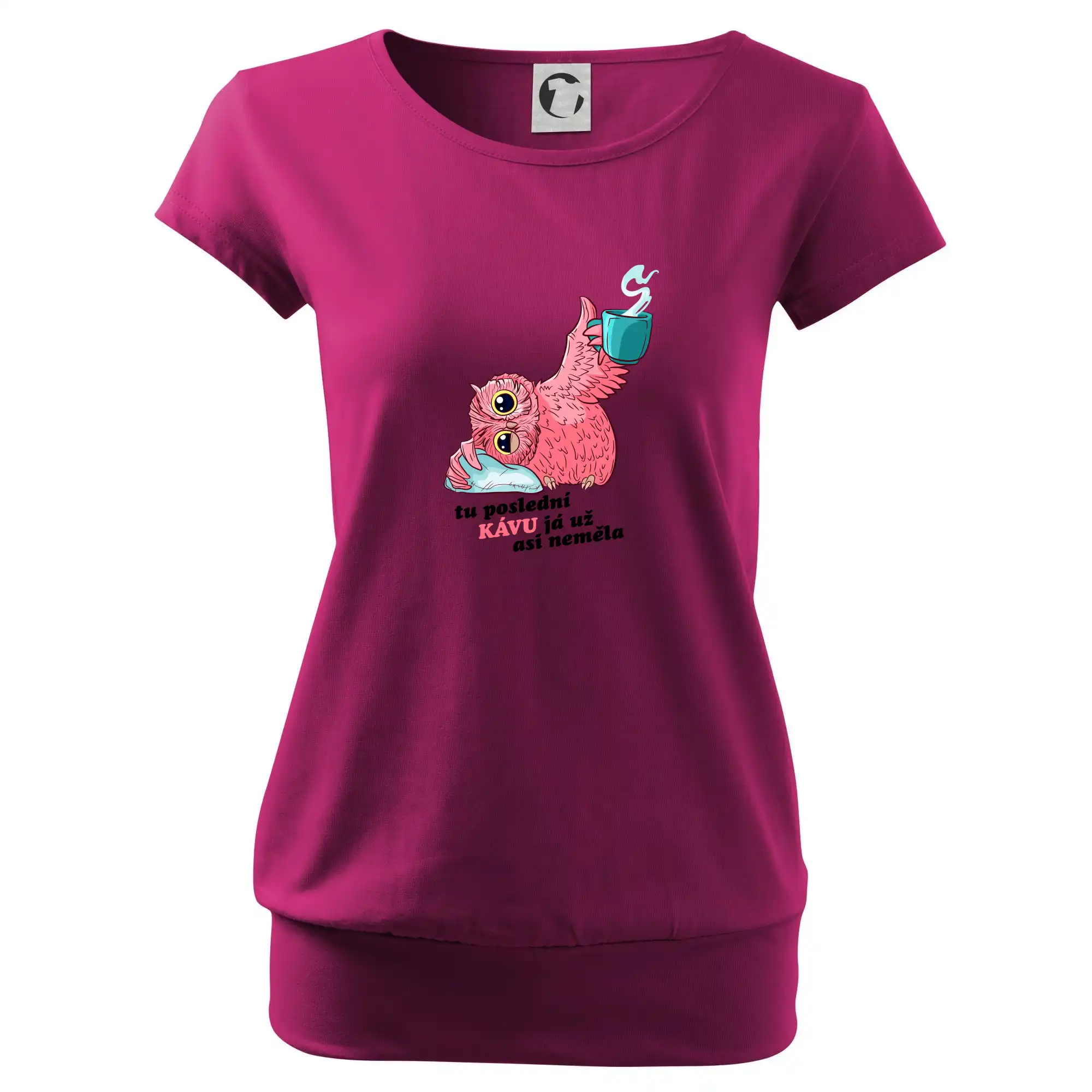 Trendové dámské triko s velmi krátkým rukávem, volnějšího střihu, v dolním kraji všité do širokého lemu. Kulatý průkrčník s úzkým lemem ze shodného materiálu.