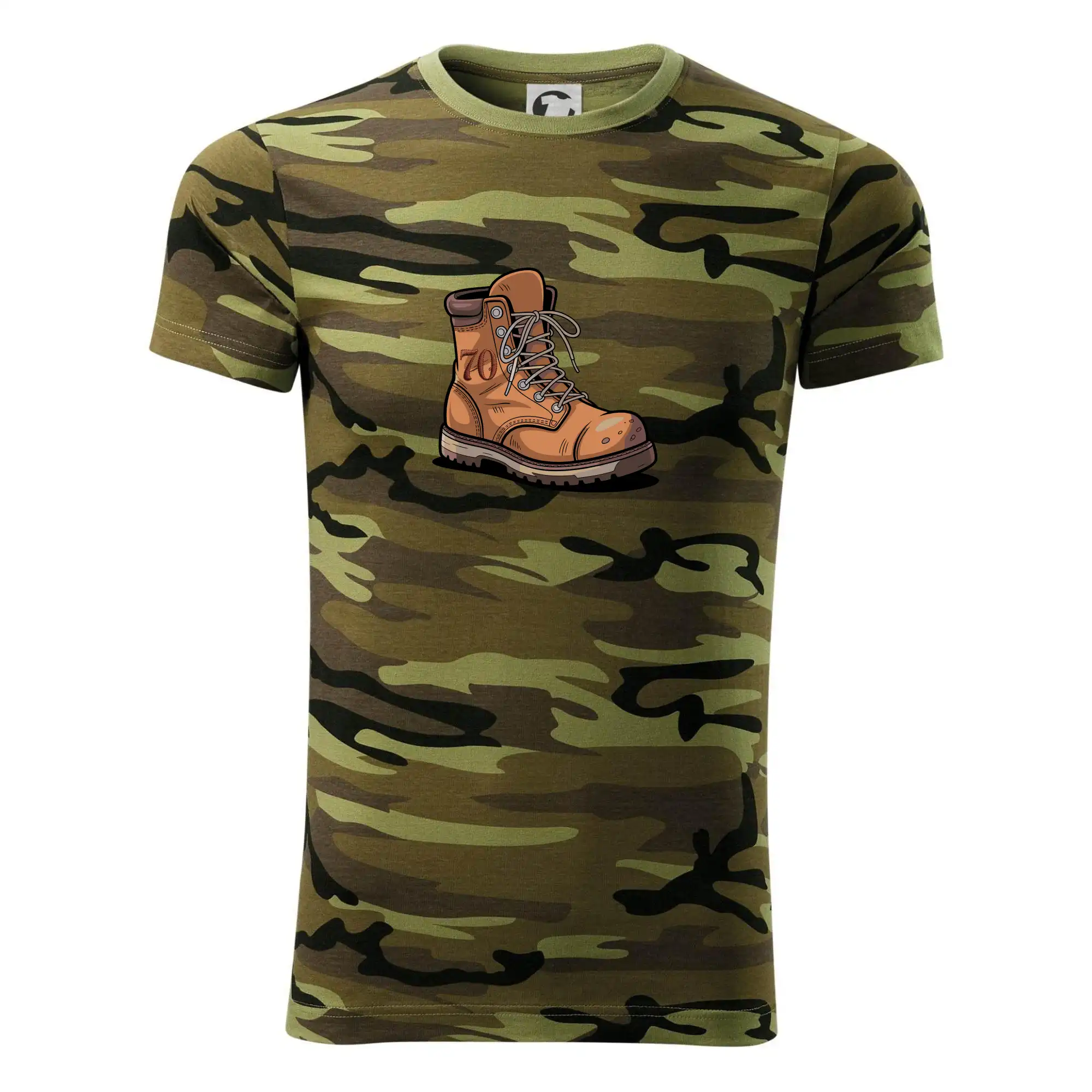 Tričko střední gramáže v barvách camouflage. Střih s bočními švy. Lem průkrčníku ze žebrového úpletu s přídavkem 5 % elastanu. Vnitřní část zadního průkrčníku začištěna páskou v barvě camouflage.