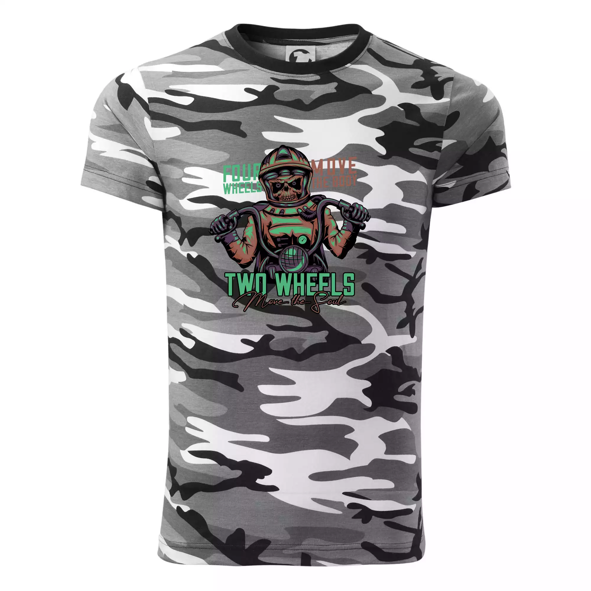 Tričko střední gramáže v barvách camouflage. Střih s bočními švy. Lem průkrčníku ze žebrového úpletu s přídavkem 5 % elastanu. Vnitřní část zadního průkrčníku začištěna páskou v barvě camouflage.