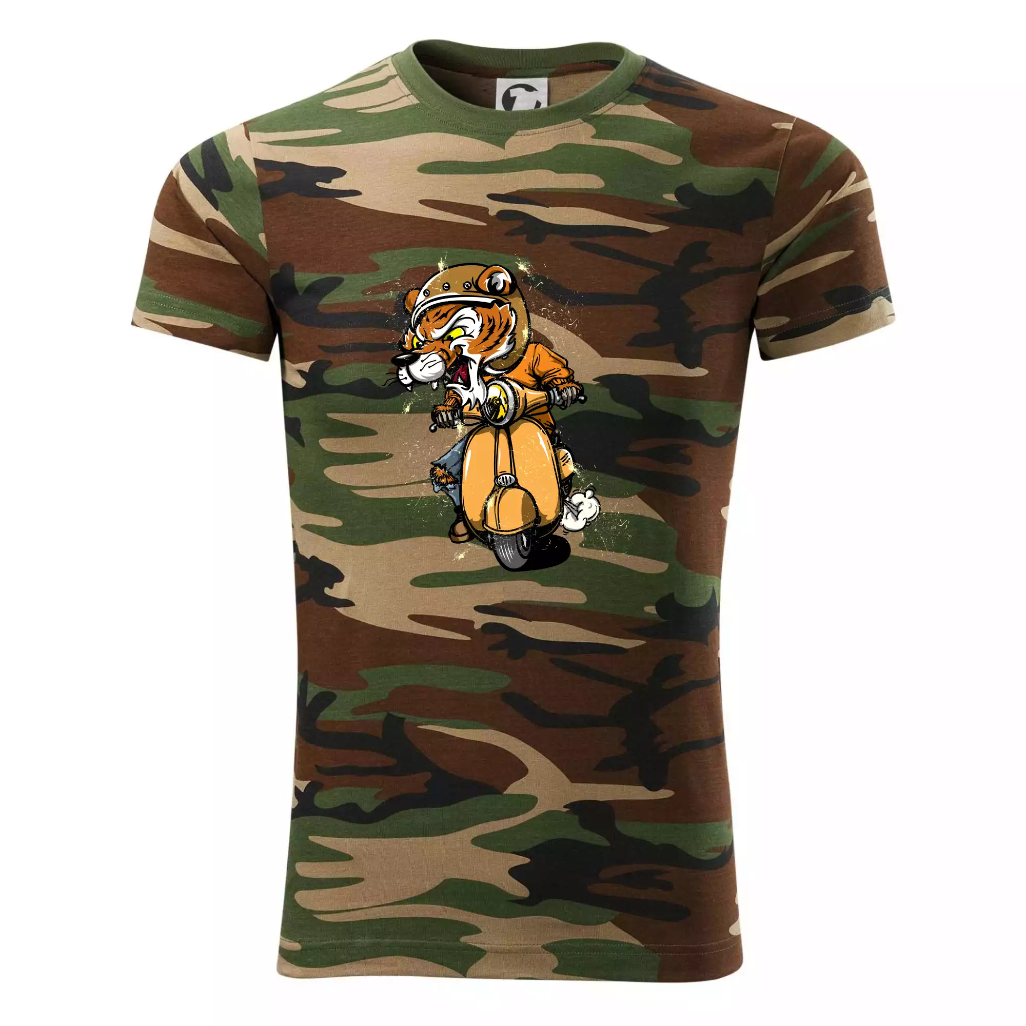 Tričko pro motorkáře, ne kterém je tygr na skútru. Motorkářské tričko, kde je motorkářem tygr, musí mít doma každý vášnivý motorkář. Tričko s tygrem je vhodný dárek pro motorkáře.