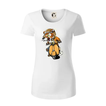 Tričko pro motorkáře, ne kterém je tygr na skútru. Motorkářské tričko, kde je motorkářem tygr, musí mít doma každý vášnivý motorkář. Tričko s tygrem je vhodný dárek pro motorkáře.