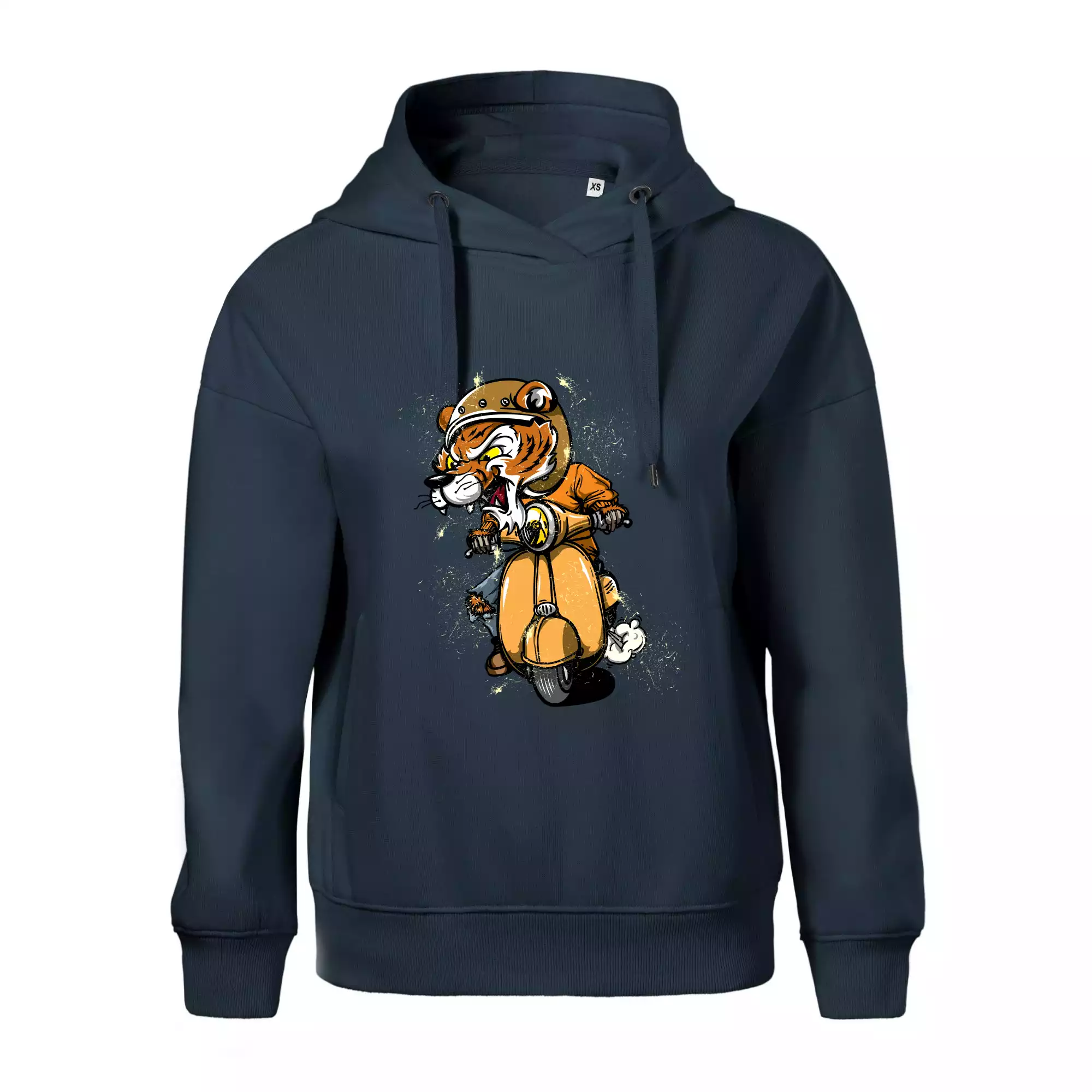 Tričko pro motorkáře, ne kterém je tygr na skútru. Motorkářské tričko, kde je motorkářem tygr, musí mít doma každý vášnivý motorkář. Tričko s tygrem je vhodný dárek pro motorkáře.