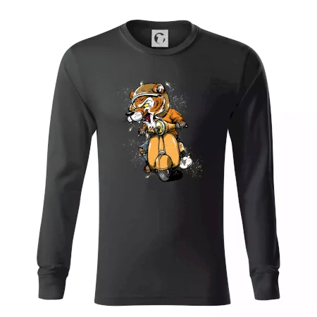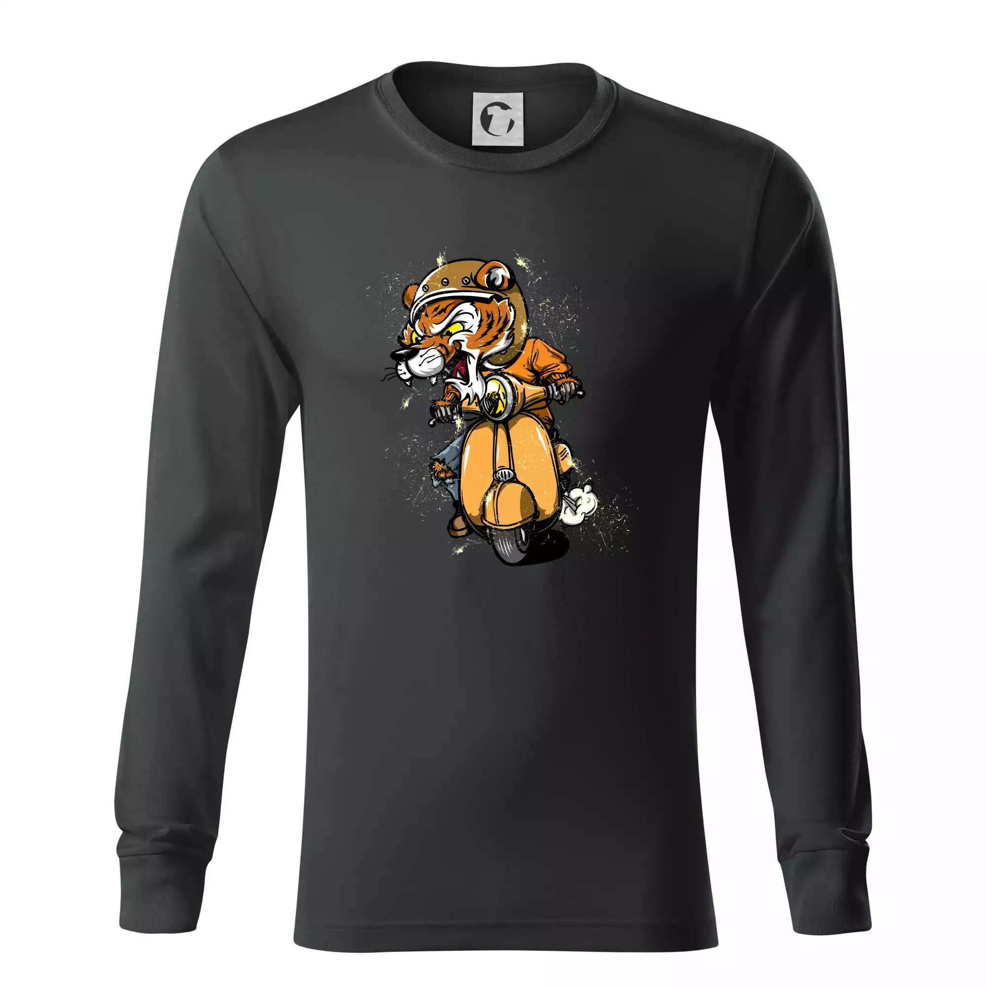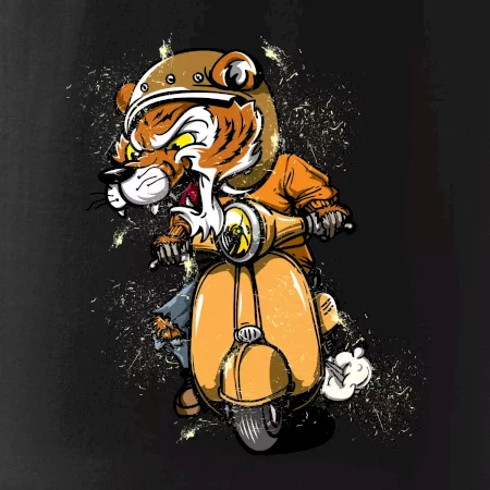 Tričko pro motorkáře, ne kterém je tygr na skútru. Motorkářské tričko, kde je motorkářem tygr, musí mít doma každý vášnivý motorkář. Tričko s tygrem je vhodný dárek pro motorkáře.