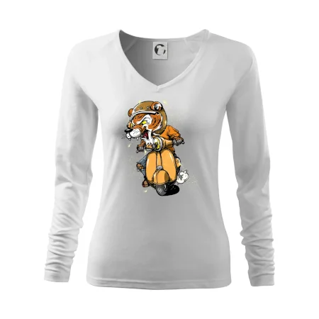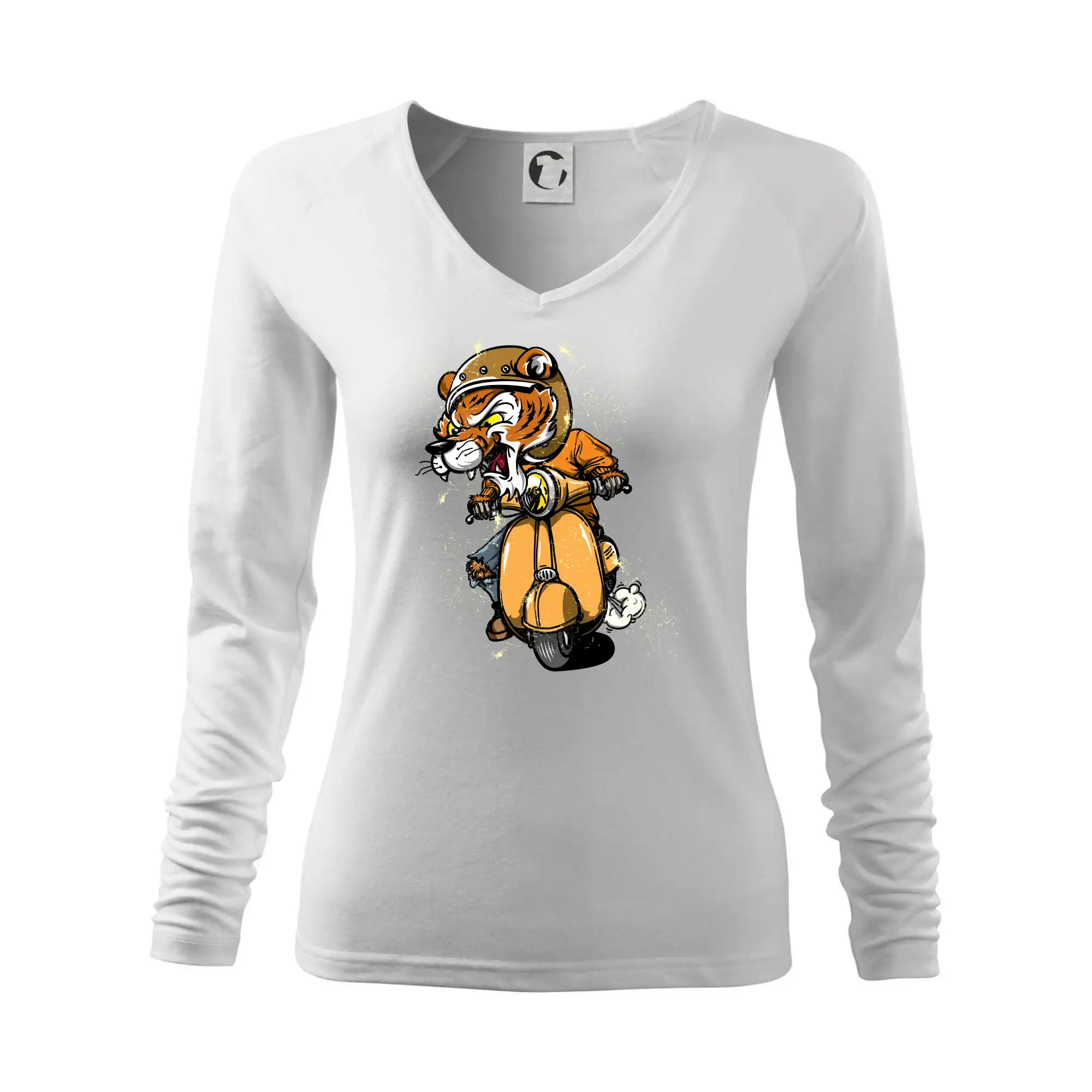 Tričko pro motorkáře, ne kterém je tygr na skútru. Motorkářské tričko, kde je motorkářem tygr, musí mít doma každý vášnivý motorkář. Tričko s tygrem je vhodný dárek pro motorkáře.