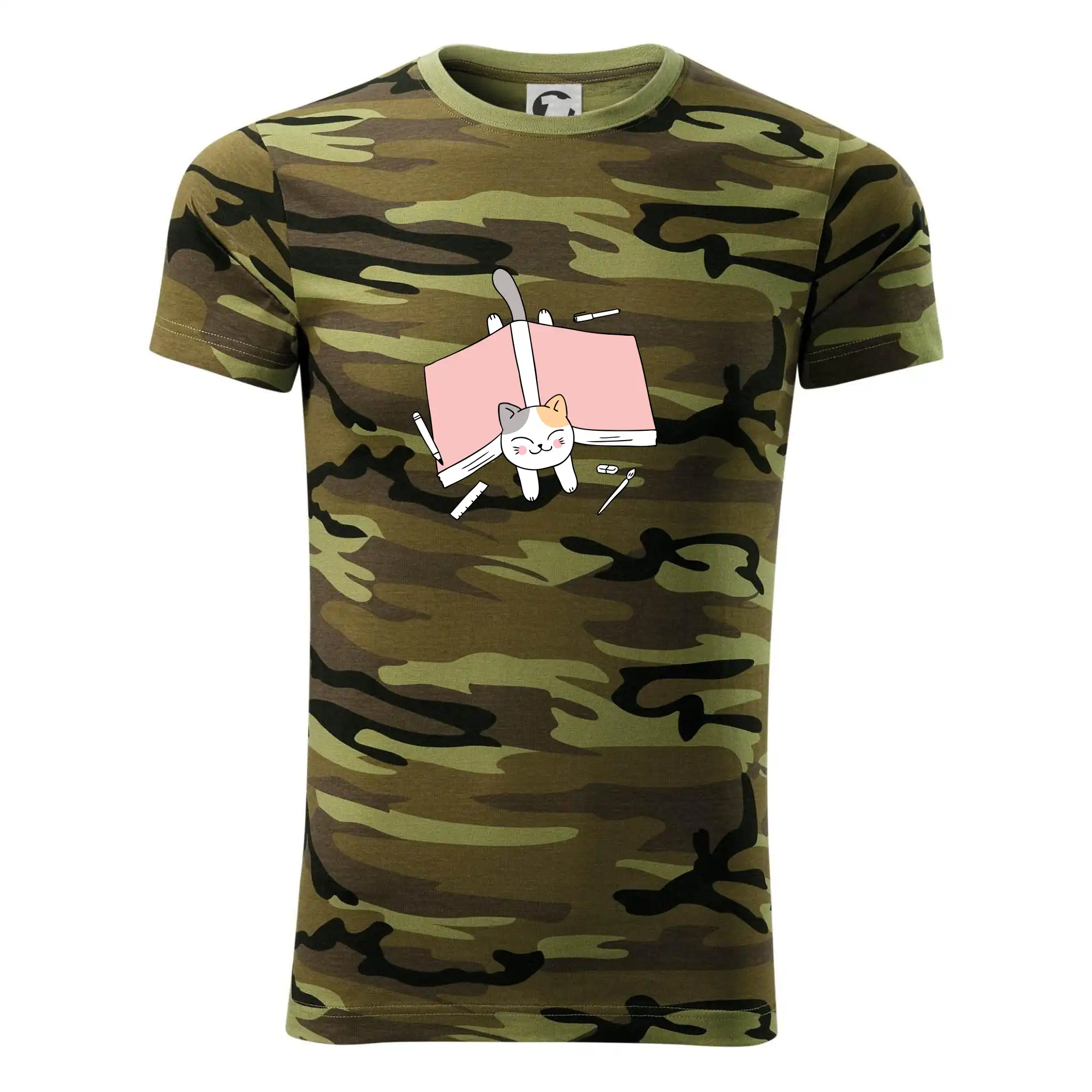 Tričko střední gramáže v barvách camouflage. Střih s bočními švy. Lem průkrčníku ze žebrového úpletu s přídavkem 5 % elastanu. Vnitřní část zadního průkrčníku začištěna páskou v barvě camouflage.