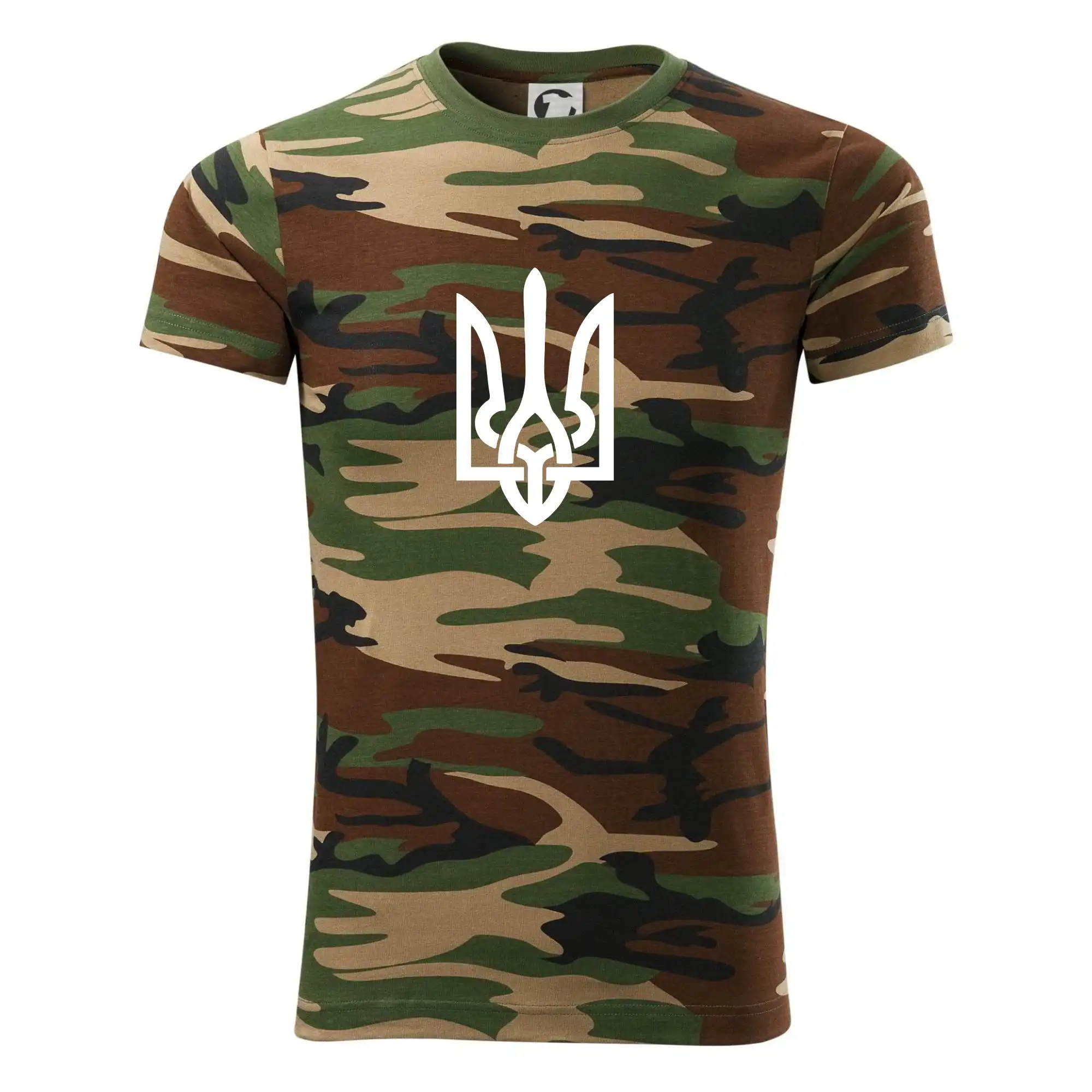 Tričko střední gramáže v barvách camouflage. Střih s bočními švy. Lem průkrčníku ze žebrového úpletu s přídavkem 5 % elastanu. Vnitřní část zadního průkrčníku začištěna páskou v barvě camouflage.