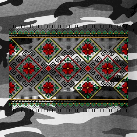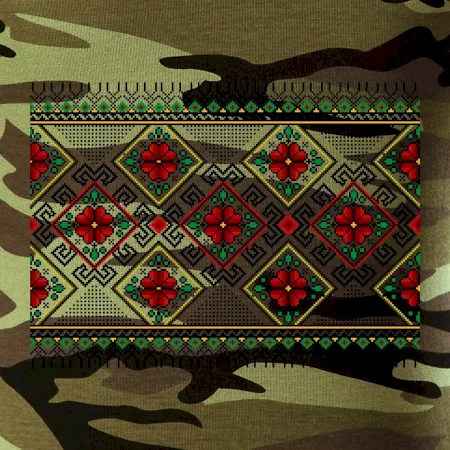 Tričko střední gramáže v barvách camouflage. Střih s bočními švy. Lem průkrčníku ze žebrového úpletu s přídavkem 5 % elastanu. Vnitřní část zadního průkrčníku začištěna páskou v barvě camouflage.