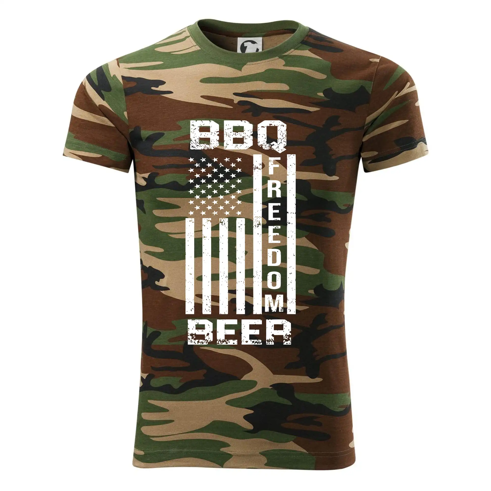 Tričko střední gramáže v barvách camouflage. Střih s bočními švy. Lem průkrčníku ze žebrového úpletu s přídavkem 5 % elastanu. Vnitřní část zadního průkrčníku začištěna páskou v barvě camouflage.