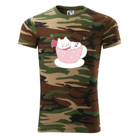 Tričko střední gramáže v barvách camouflage. Střih s bočními švy. Lem průkrčníku ze žebrového úpletu s přídavkem 5 % elastanu. Vnitřní část zadního průkrčníku začištěna páskou v barvě camouflage.