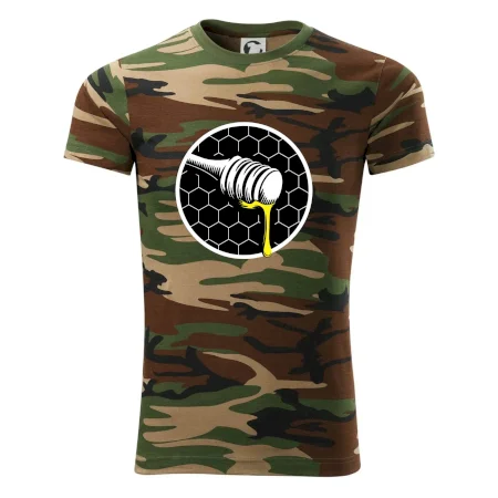 Tričko střední gramáže v barvách camouflage. Střih s bočními švy. Lem průkrčníku ze žebrového úpletu s přídavkem 5 % elastanu. Vnitřní část zadního průkrčníku začištěna páskou v barvě camouflage.